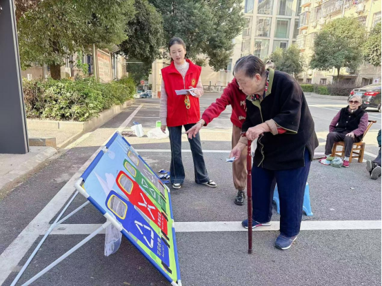 互动环节中,“分类精准投”游戏最受欢迎,居民将印有垃圾图案的沙包投进对应分类口袋即可领礼品;有奖问答环节设10道题,居民举手抢答,答对可获抽纸、分类标识围裙等礼品,现场抢答声与欢呼声不断。