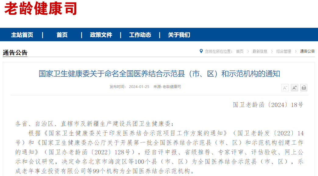 国家卫生健康委表示,希望命名的全国医养结合示范县(市、区)和示范机构不断完善医养结合政策体系,持续提升医养结合服务能力和水平,更好地满足广大老年人健康养老服务需求。各地要广泛宣传推广示范单位的经验做法,发挥示范引领作用,形成辐射带动效应,推动医养结合工作高质量发展。