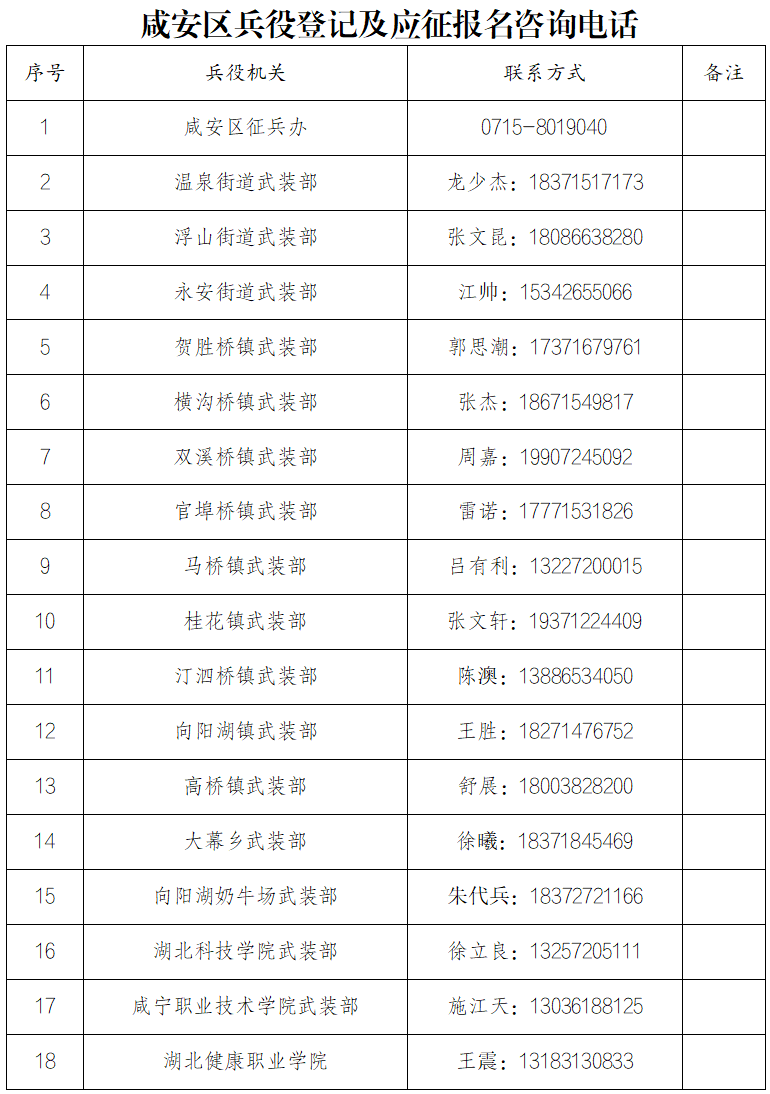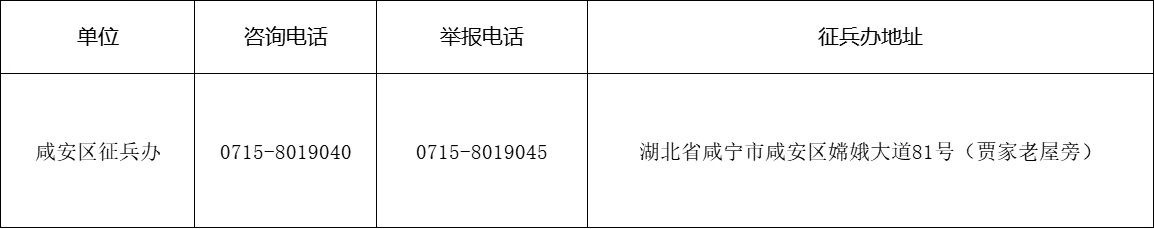 有关政策法规可查询“全国征兵网”或关注“湖北征兵”公众号,咸安区征兵办公室咨询电话:0715-8019040。