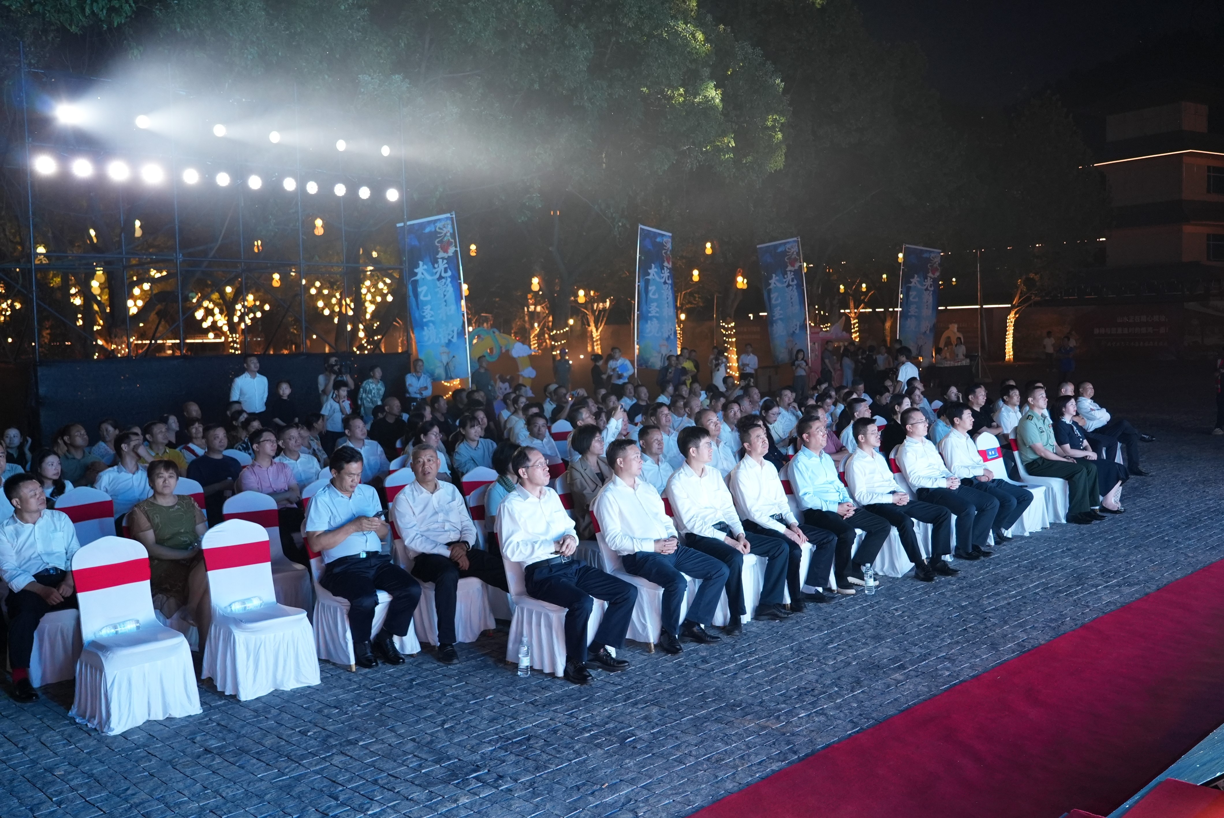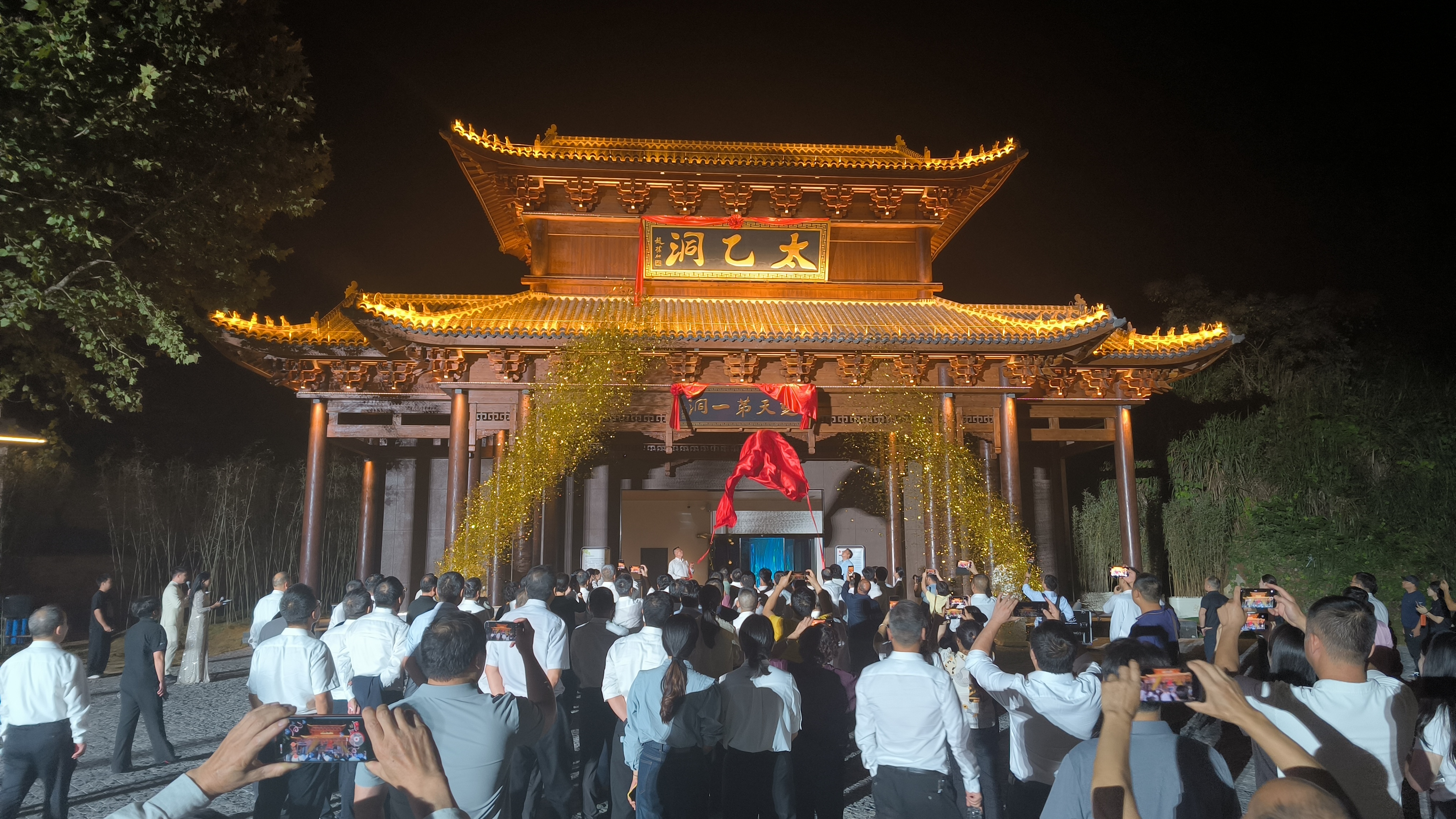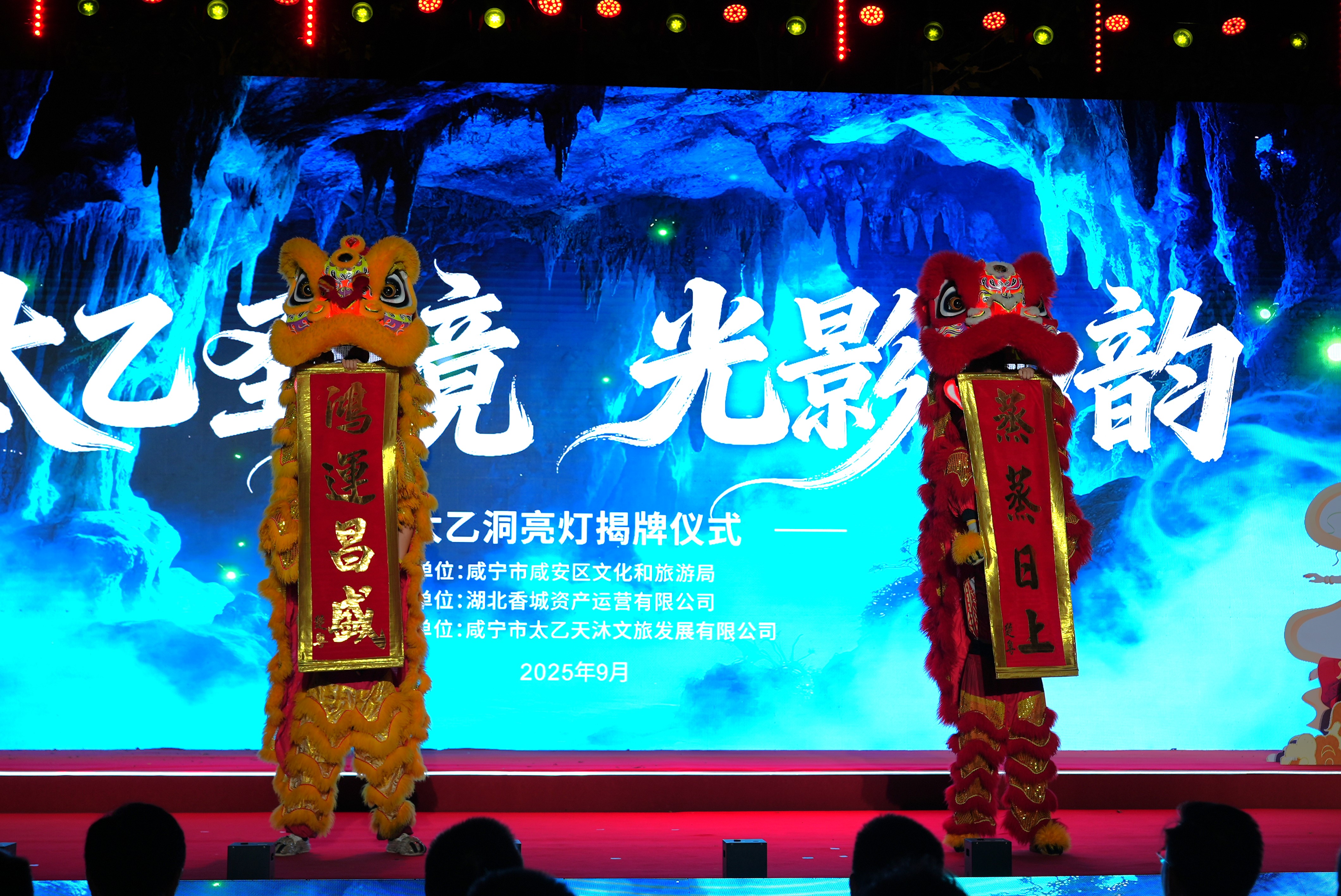 在令人瞩目的亮灯启幕环节,受邀领导与嘉宾缓步走向舞台中央的启动台,共同按下启动键。刹那间,启动台迸发璀璨光芒,舞台后方的巨型LED屏同步切换为太乙洞绝美实景。亮灯仪式后,嘉宾们移步太乙洞景区入口,参与庄重的揭牌仪式。随着领导与企业家共同揭下红绸,“楚天第一洞”五个笔力遒劲的鎏金大字熠熠生辉,现场礼炮齐鸣、彩带纷飞。这一时刻,不仅标志着太乙洞景区试运营的正式启动,更宣告着咸安区文旅产业再添重磅地标。