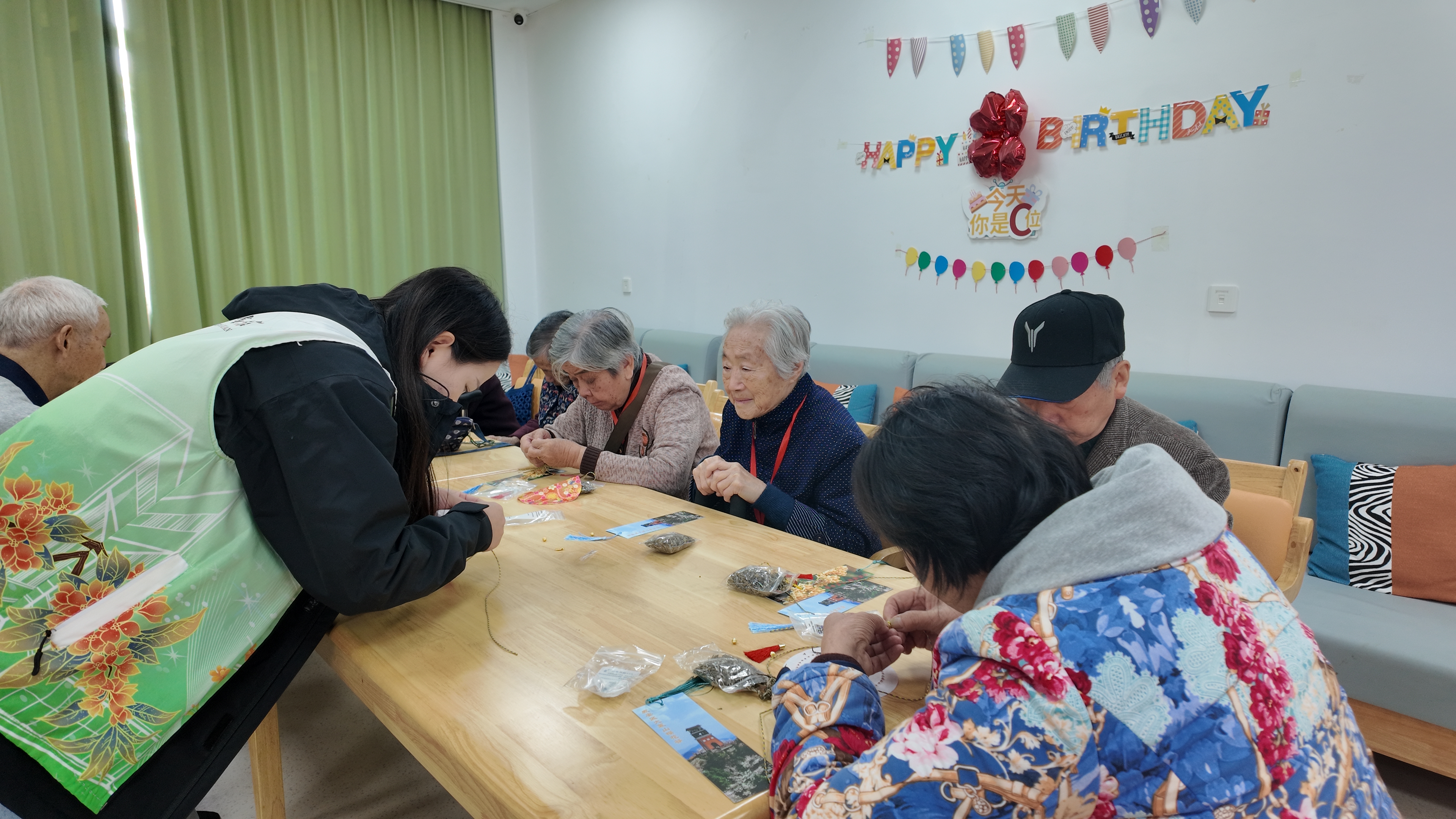 “巧手制香囊”环节兼顾实用与文化属性,图书馆员详细讲解香囊制作步骤,辅助老人穿针引线,调整布料位置。制作间隙,图书馆员同步分享重阳节佩戴香包的习俗渊源,老人们在手工创作中感受节日氛围,让手中的香囊成为传递温情的载体。