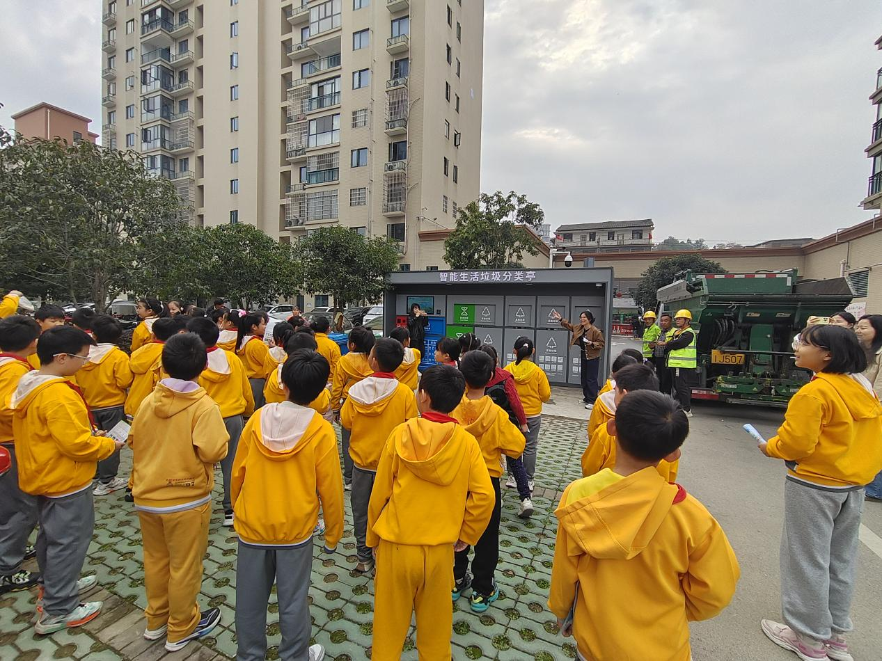 在智能生活垃圾分类亭前,市环卫局工作人员与社区志愿者结合实物与案例,为孩子们详细讲解了垃圾分类的标准、意义及常见误区,同时演示了智能分类亭如何通过扫码识别、自动称重等科技手段,方便居民实现精准投放。