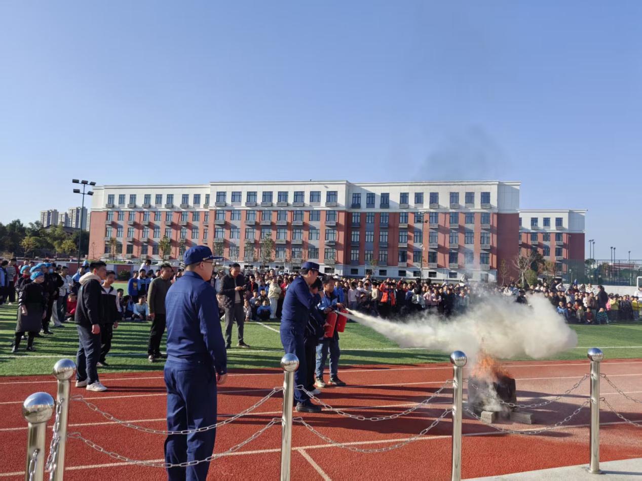 疏散集结后,消防人员带来专业消防技能培训。现场演示干粉灭火器“提、拔、握、压”四字使用诀窍,并指导师生和后勤人员代表实操灭火。