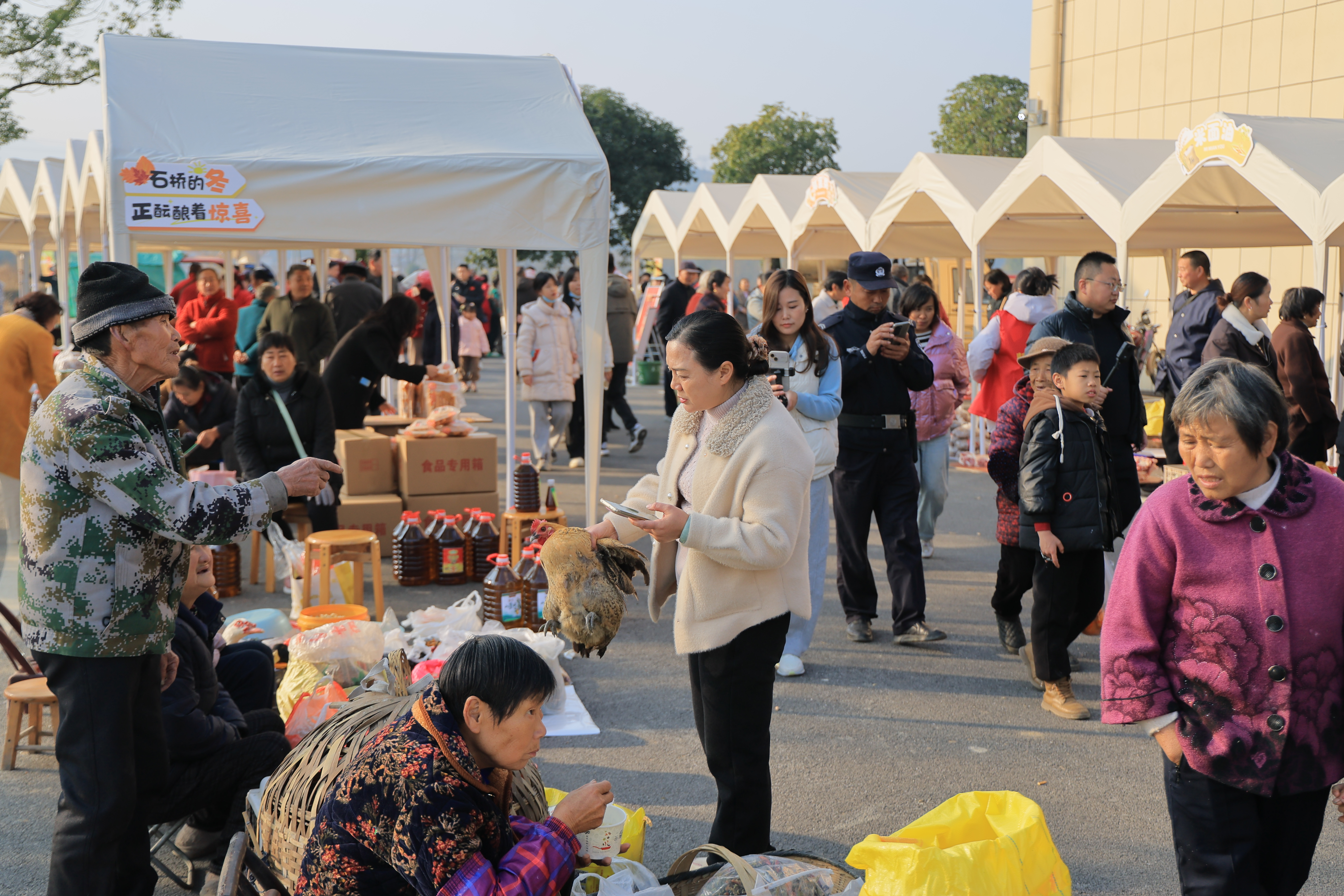 12月7日,咸安区大幕乡石桥村的“乡村邻里节·‘石’全‘食’美集市”热闹开场。集市上,再生稻米、散养土鸡、现榨菜籽油等20多种农产品摆满摊位,村民热情吆喝,游客驻足选购,询价声、欢笑声不绝于耳。