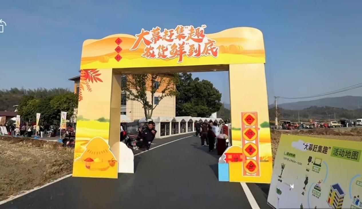 冬阳初升,大幕山的晨雾尚未散尽,如薄纱般轻覆于青黛色的山脊。山坳间,几缕炊烟袅袅升起,与朝霞交织,仿若大地在悠然吐纳。山势层叠绵延,松杉苍翠,竹影婆娑,偶有山雀掠过林梢。山脚之下,石桥村新村委会前的晒谷场早已焕然一新:红绸缠柱,彩旗招展。村口道路中央,橘黄色的拱门上,“大幕赶集‘趣’ 农货‘鲜’到底”十个大字墨色酣畅;“助农手牵手,丰收心连心”等宣传条幅迎风飘扬。这喜气并不张扬,却笃定地映入每一双眼帘。风过处,旗角轻扬,似有无形之手,在山野间拨动一根悠长的琴弦。