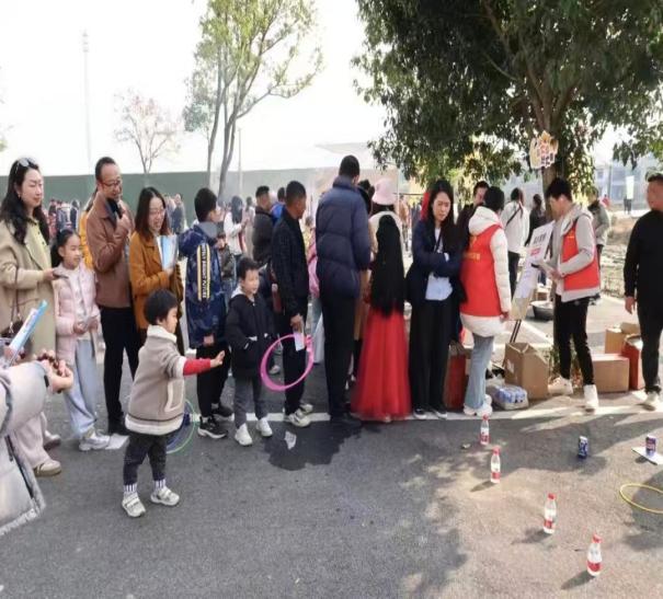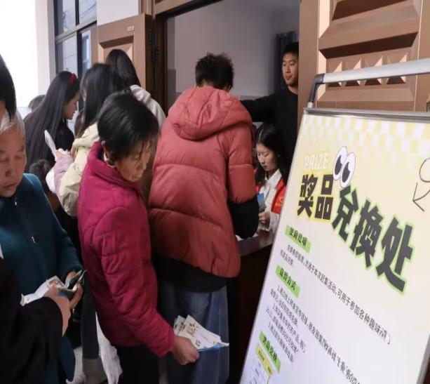 晒谷场北侧的游园区热闹非凡。少年们踢着毽子腾跃如鹿,毽子在脚踝间灵巧翻飞,发出银铃般的脆响;拔河绳紧绷成一道弧线,两队村民赤脚踏入松软的泥土,震天的吼声惊飞了枝头的麻雀;知识答题棚下,白发老者扶镜细读题目,小孙子踮脚凑近,祖孙俩为“反诈三不”争得面红耳赤,答案揭晓时引来哄堂大笑。特制的银票上印着山茶花与稻穗,盖有“大幕乡集”的朱红印章。参与者热情高涨,在各类趣味游戏中齐心协力竞技,获胜者凭银票兑换土鸡、土鸡蛋等礼品。游客们通过线上转发集赞或现场消费也能兑换银票,大人们捧着满满的“战利品”,脸上洋溢着满足的笑容。孩子们则拿着银票奔向兑换处,换来小竹篮和艾草香囊,欢快的笑声撞向山壁又反弹回来,一圈圈荡漾开去。