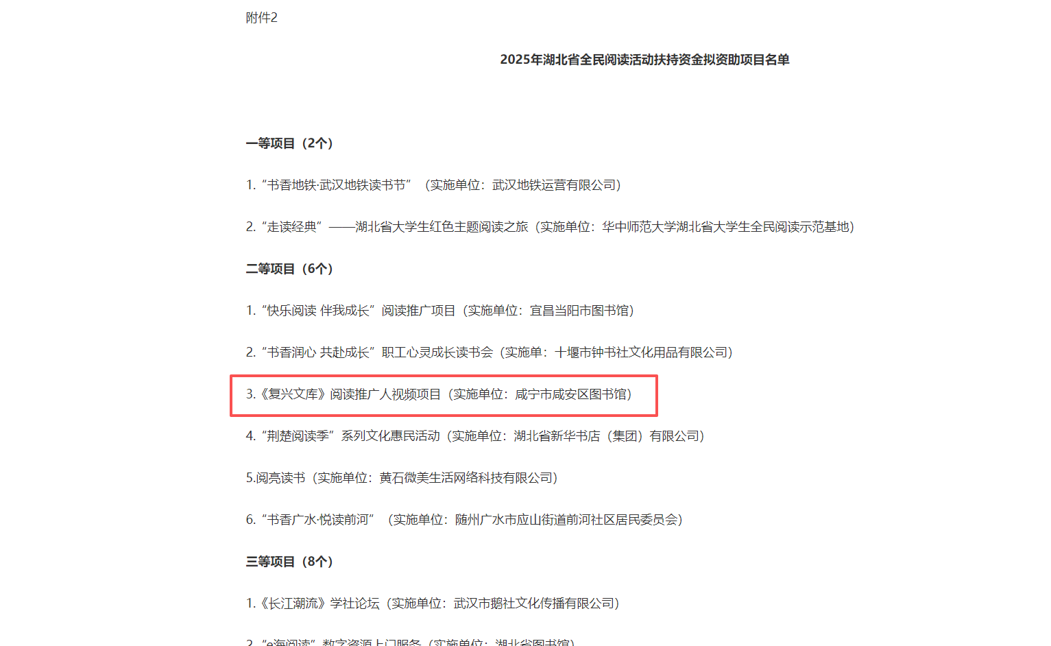 云上咸安报道 近期,由湖北省新闻出版局组织的“书香湖北”全民阅读扶持资助项目评选结果正式公布。本次评选共设立一等项目(2个)、二等项目(6个)、三等项目(8个)、优秀项目(15个)。咸安区图书馆《复兴文库》阅读推广人视频项目在咸安区委宣传部、区文化和旅游局党组的指导下,凭借创新的推广模式、扎实的实施成效与深远的文化价值,在众多评选项目中脱颖而出,荣获二等项目奖。