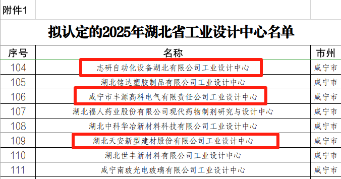 云上咸安报道 近日,湖北省经信厅公布拟认定的2025年度省级工业设计中心名单。咸安区共有3家企业入选,分别是:志研自动化设备湖北有限公司工业设计中心、咸宁市丰源高科电气有限责任公司工业设计中心、湖北天安新型建材股份有限公司工业设计中心。至此,咸安区省级工业设计中心总数跃升至7家。