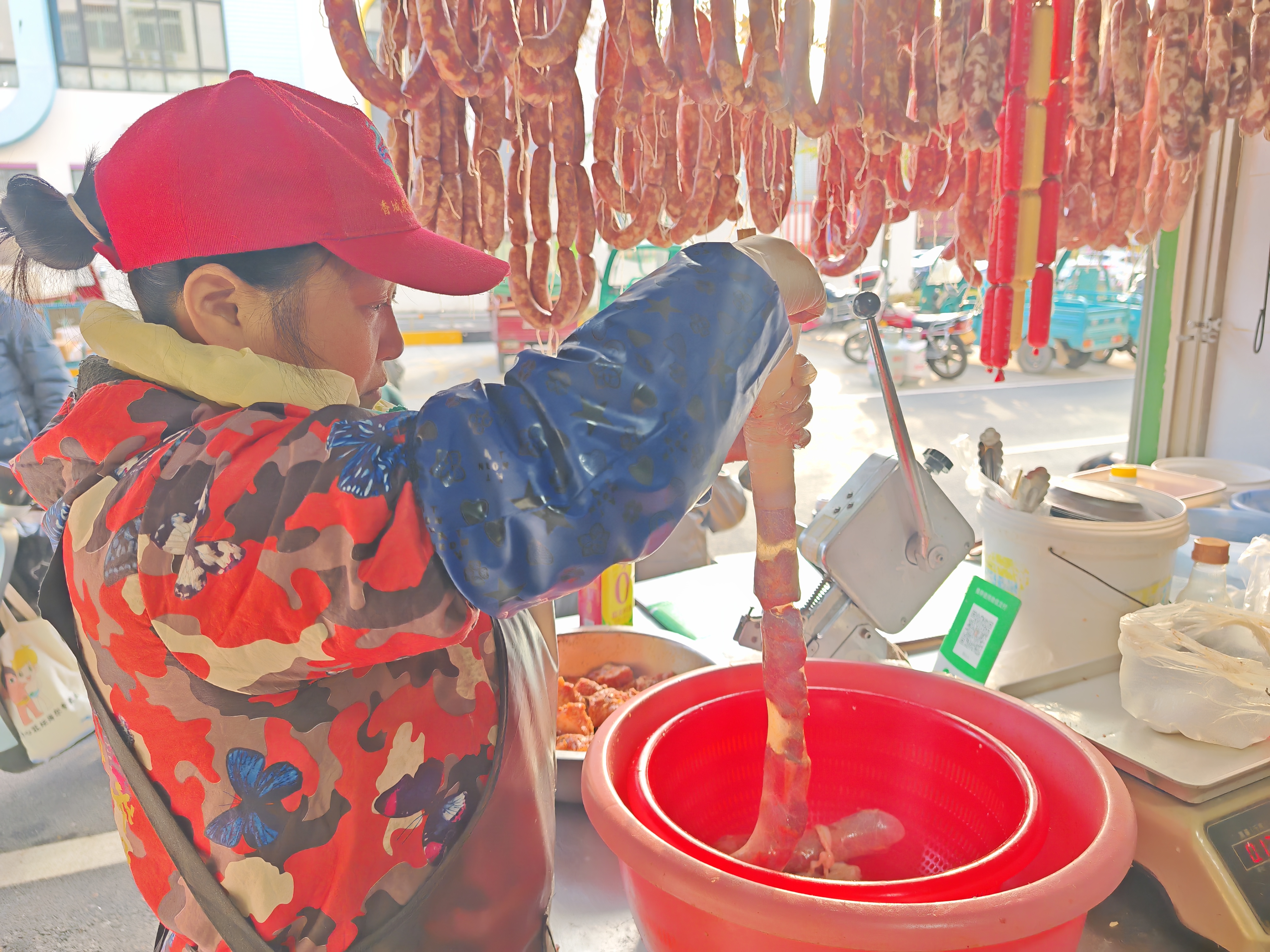在其中一家摊位前,老板徐师傅和他的助手正手脚不停地忙碌着。徐师傅从事香肠加工已有整整25个年头,是附近居民心目中的“老手艺”。“这几天人特别多,每天要灌一千多斤肉,从早忙到晚。”徐师傅一边麻利地操作着机器,一边告诉记者,这样火爆的场面已经持续了三四天,预计要一直忙到元旦之后。他的加工费实惠,每斤仅收5元,加上手艺好、为人实在,积累了众多忠实顾客。