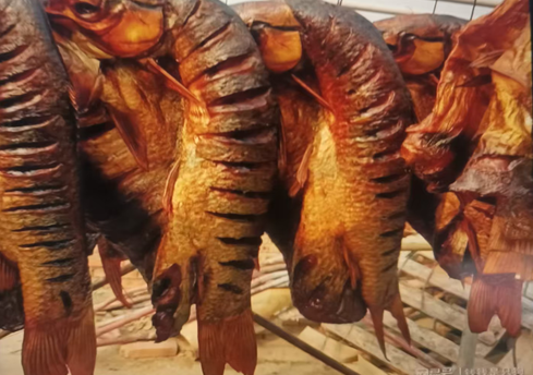 七天之后启坛,肉色已染上深褐的光泽,鱼肉则泛着莹润的淡黄,咸香混着酒香扑面而来。这时便要把肉条、鱼块一一拎出,晾在晒场的竹竿上。冬日的太阳温温软软,晒得肉皮微微收缩,油脂凝出一层薄薄的白霜;鱼肉的边缘渐渐卷起,水分蒸发后愈发紧实。待晒得半干,再搬进堂屋,挂在火炉上方的横梁上熏制,柴火的烟气混着橘皮、柏树枝的清香,丝丝缕缕钻进肉和鱼的纹路里。日子一久,腊肉腊鱼便都有了烟火熏染的醇厚底色,勾着人的馋虫。如今即便用上了智能温控的烘干箱,不少老人还是偏爱柴火熏制的味道,说那是机器复刻不出的人间烟火气。