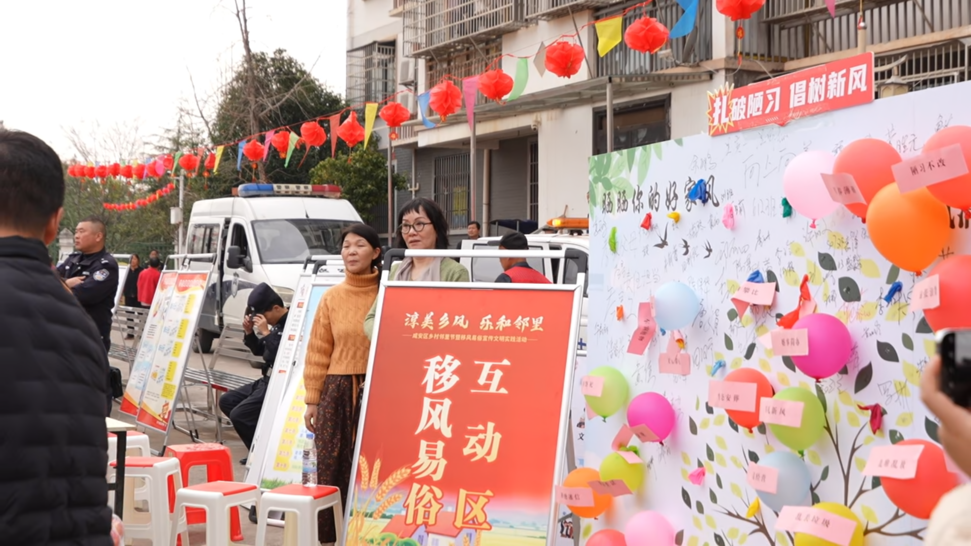 现场最引人驻足的一角,是“移风易俗破陋习”互动区。村民们将“高价彩礼”“大操大办”“铺张浪费”等陈规陋习写在气球上。随着气球被一个个吹胀、扎破,“啪、啪”的清脆声响伴随着阵阵欢呼,象征着一项项旧习被“破除”,简单有趣的仪式传递出树立新风尚的鲜明态度。
