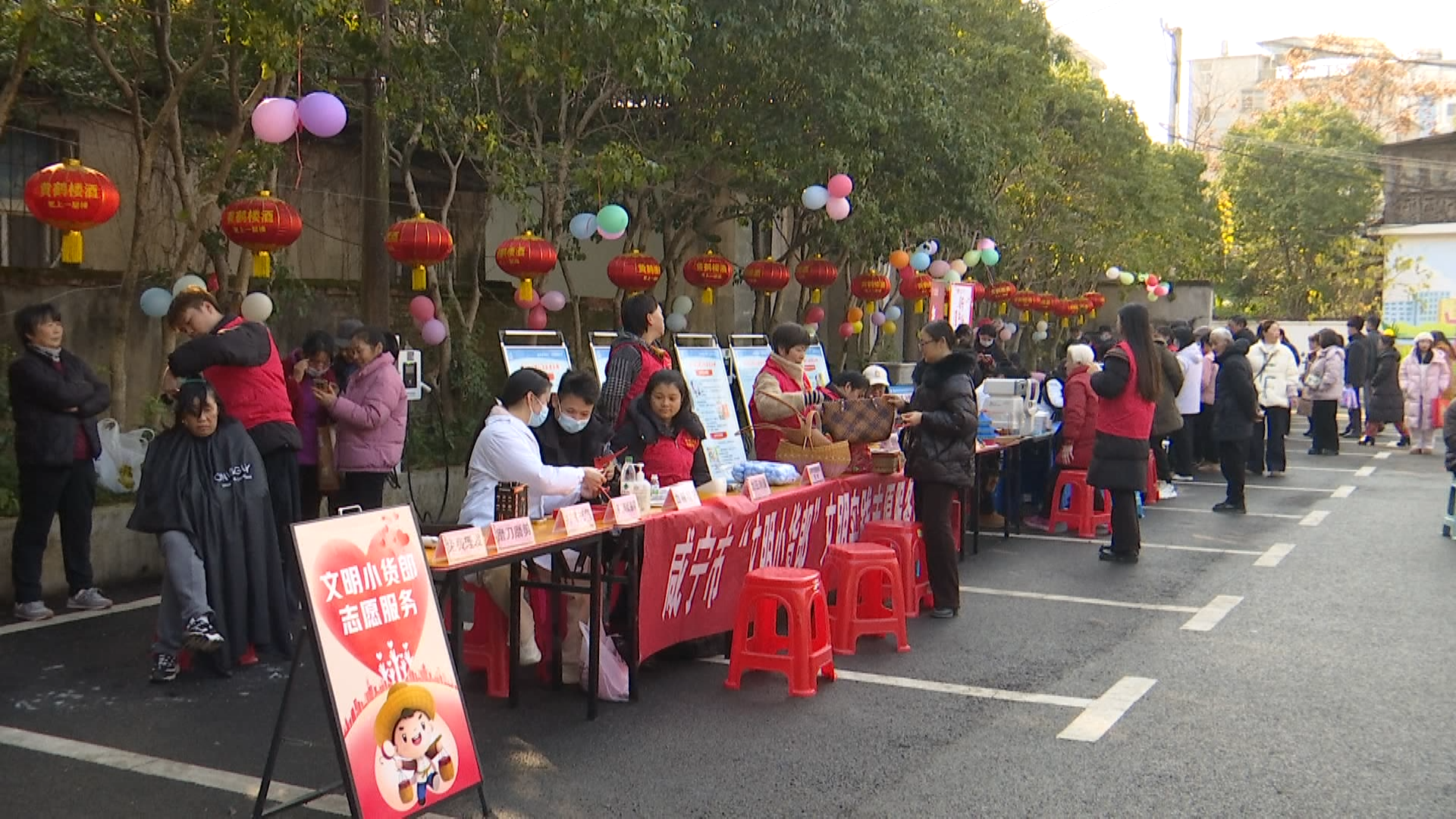 广场便民游乐区同样人气爆棚。签到处的伴手礼、暖心礼包传递温情;美食区的麻花、炕饼、咸宁米茶香气扑鼻;游戏区里,丢沙包、踩方块等趣味游戏让大人小孩乐在其中;义诊区、便民服务区前排起长队,免费理发、磨刀、健康检查等服务精准对接居民需求,把温暖送到心坎上。现场居民们三三两两互相寒暄、结伴打卡,陌生的距离悄然拉近,邻里间的温情在欢声笑语中持续升温。