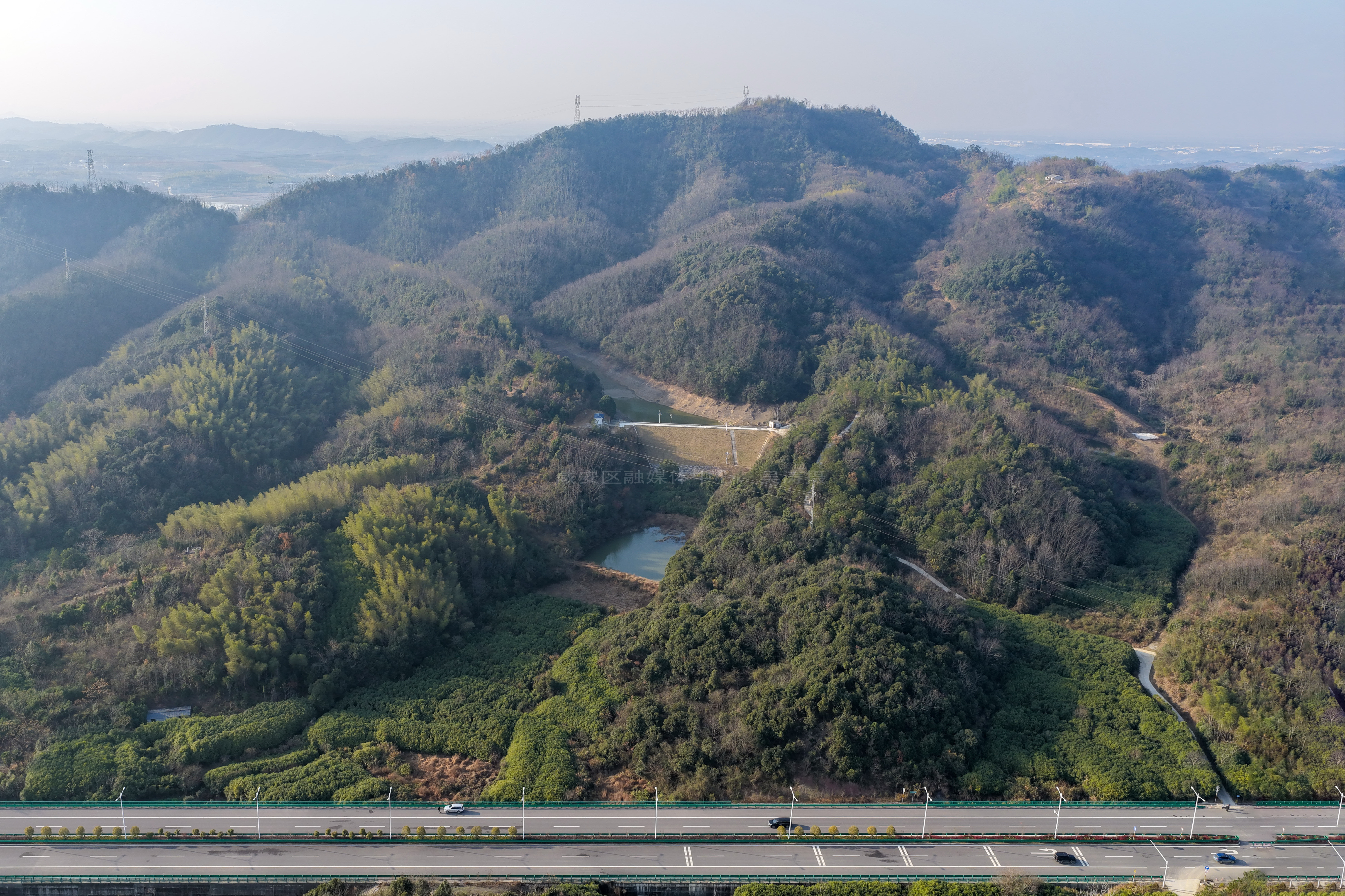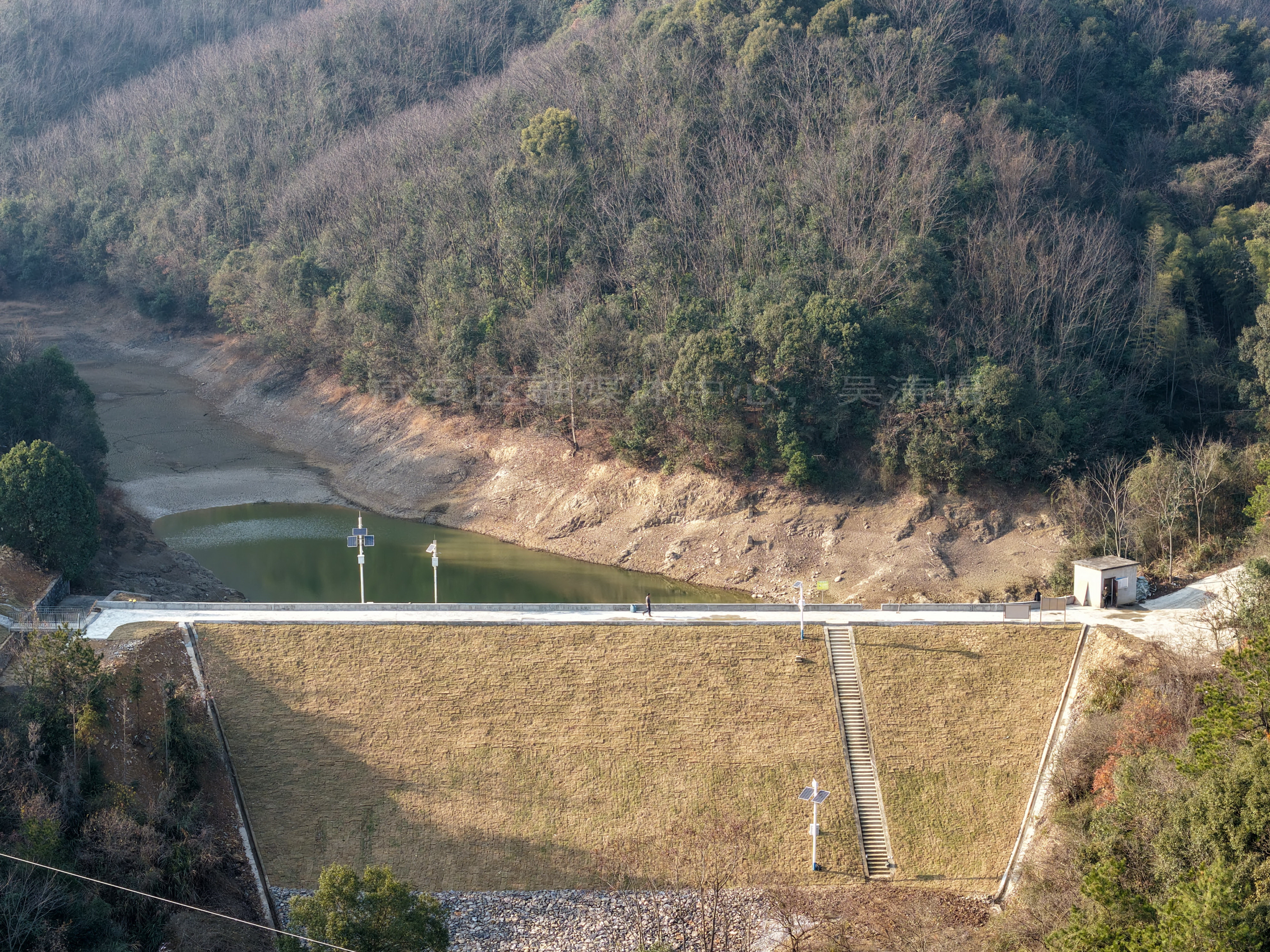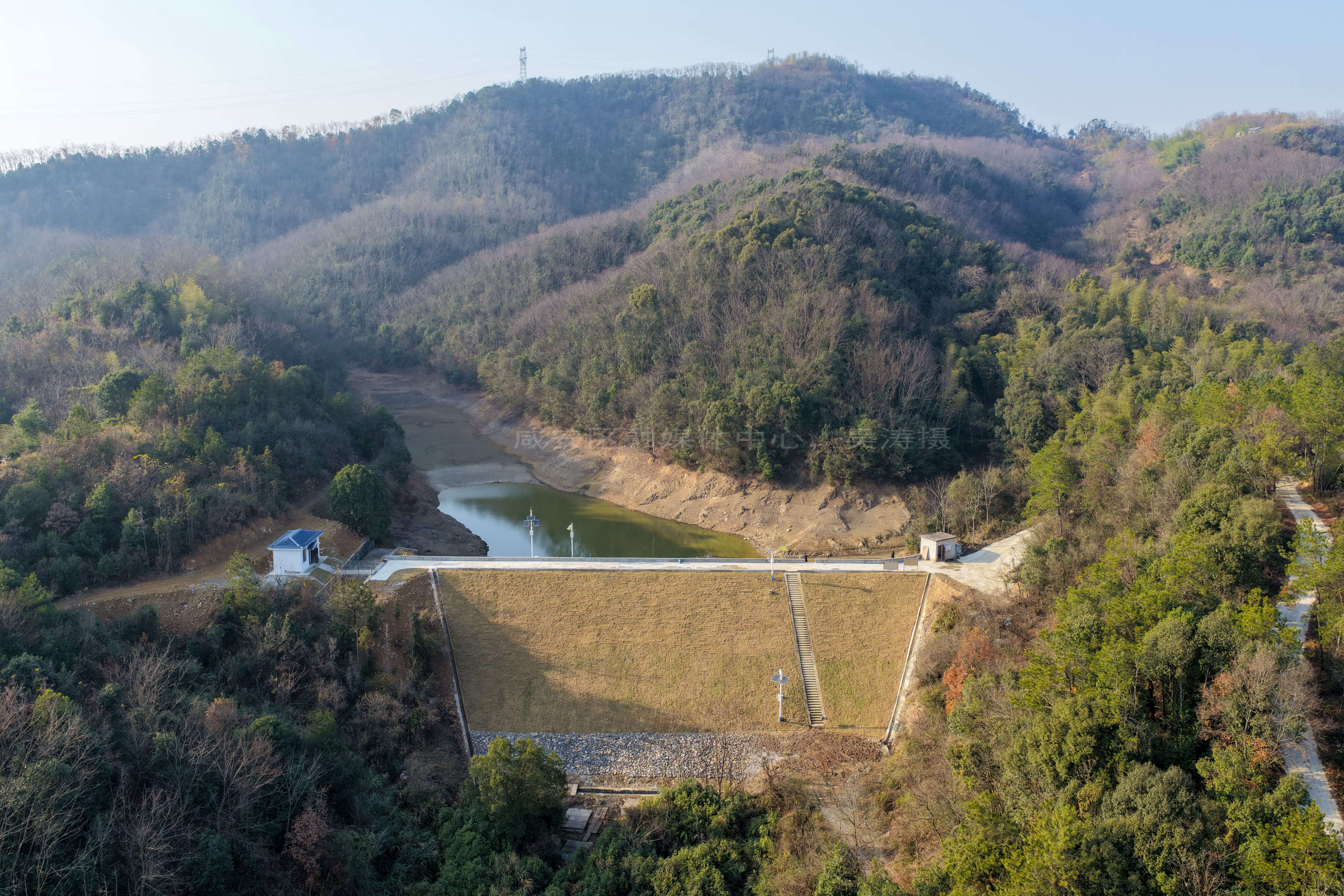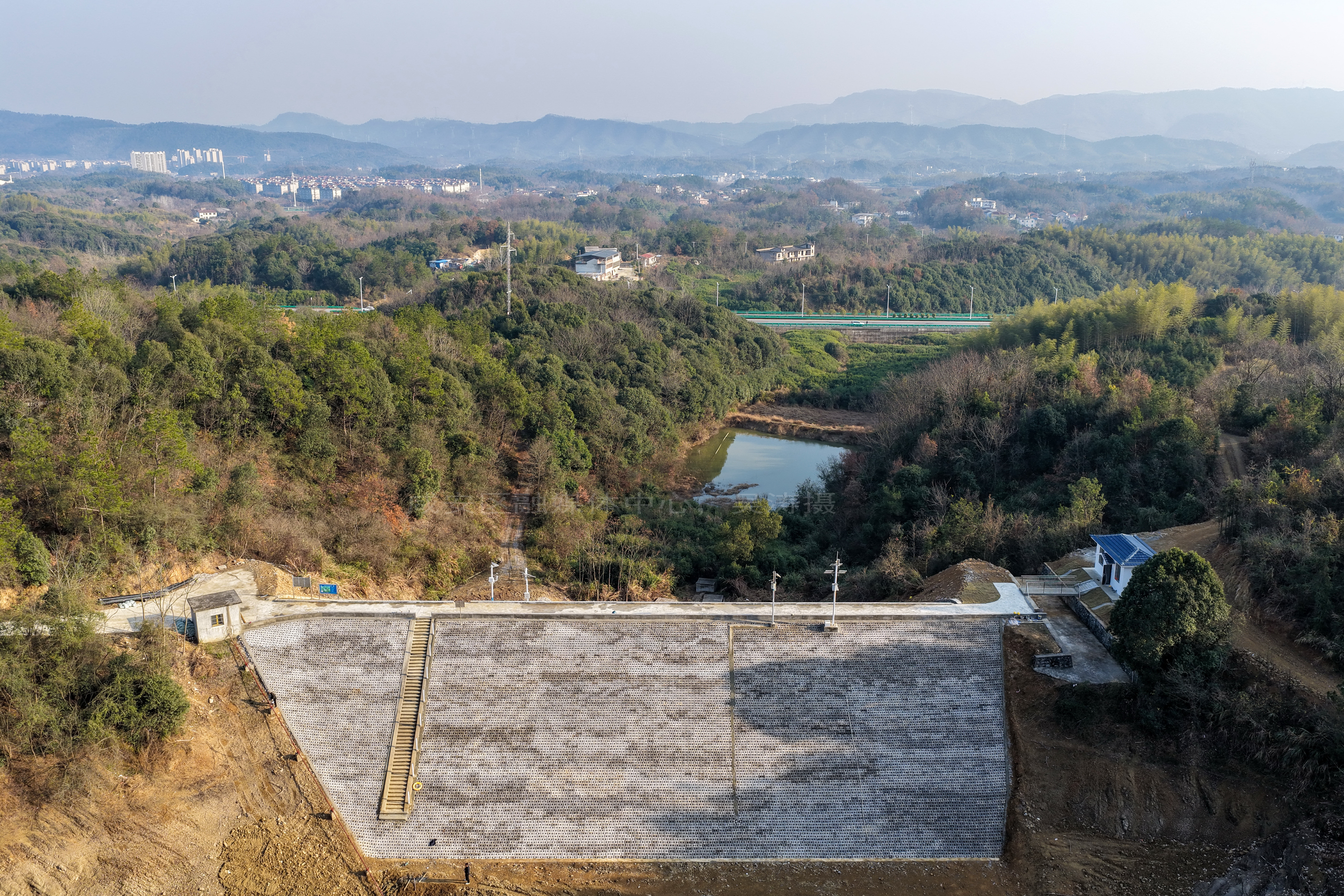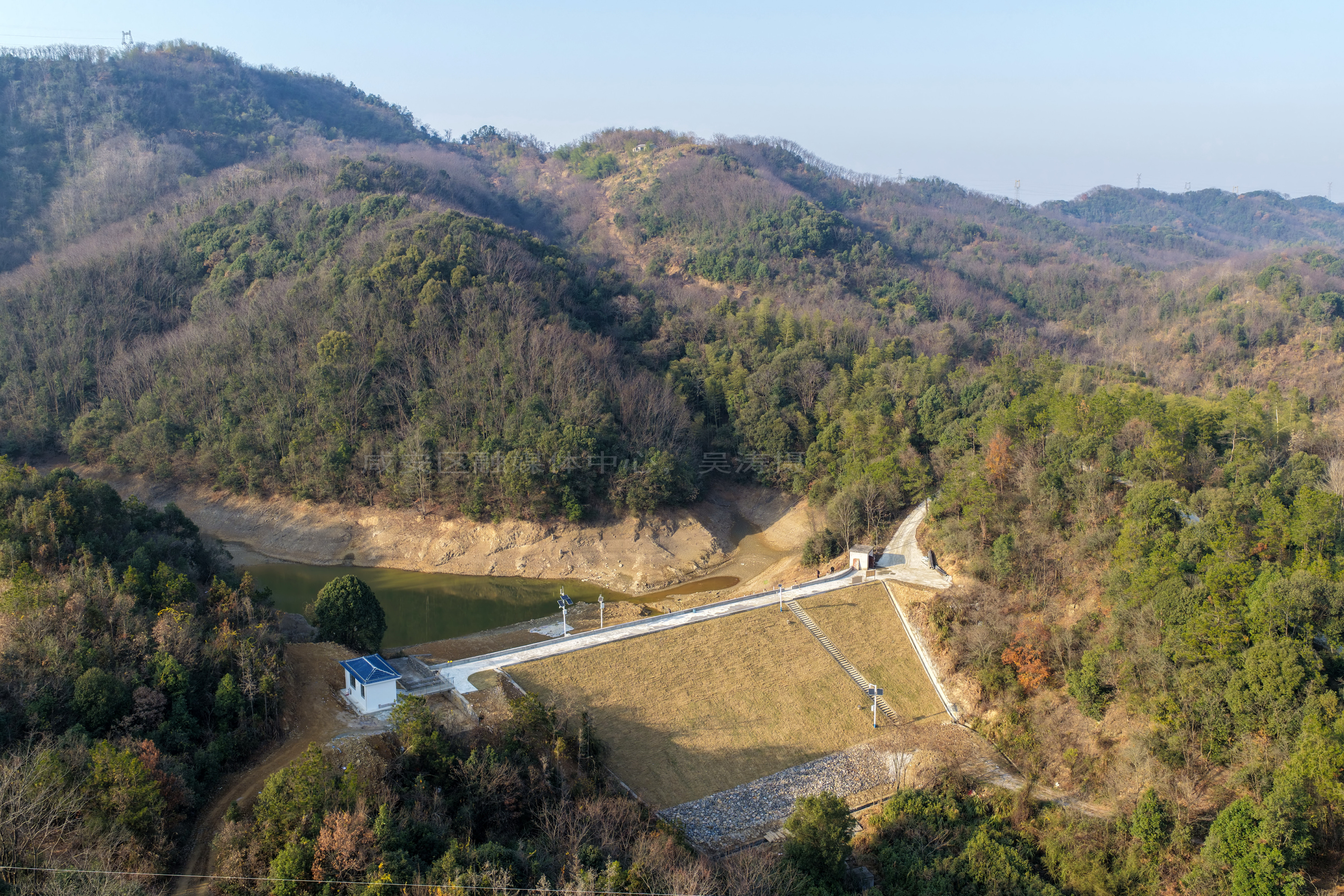 云上咸安报道 12月25日,无人机镜头下经过除险加固工程的咸安区桂英塘水库,坝体稳固、护坡整齐,面貌焕然一新,静静守护着下游的公路与村庄。