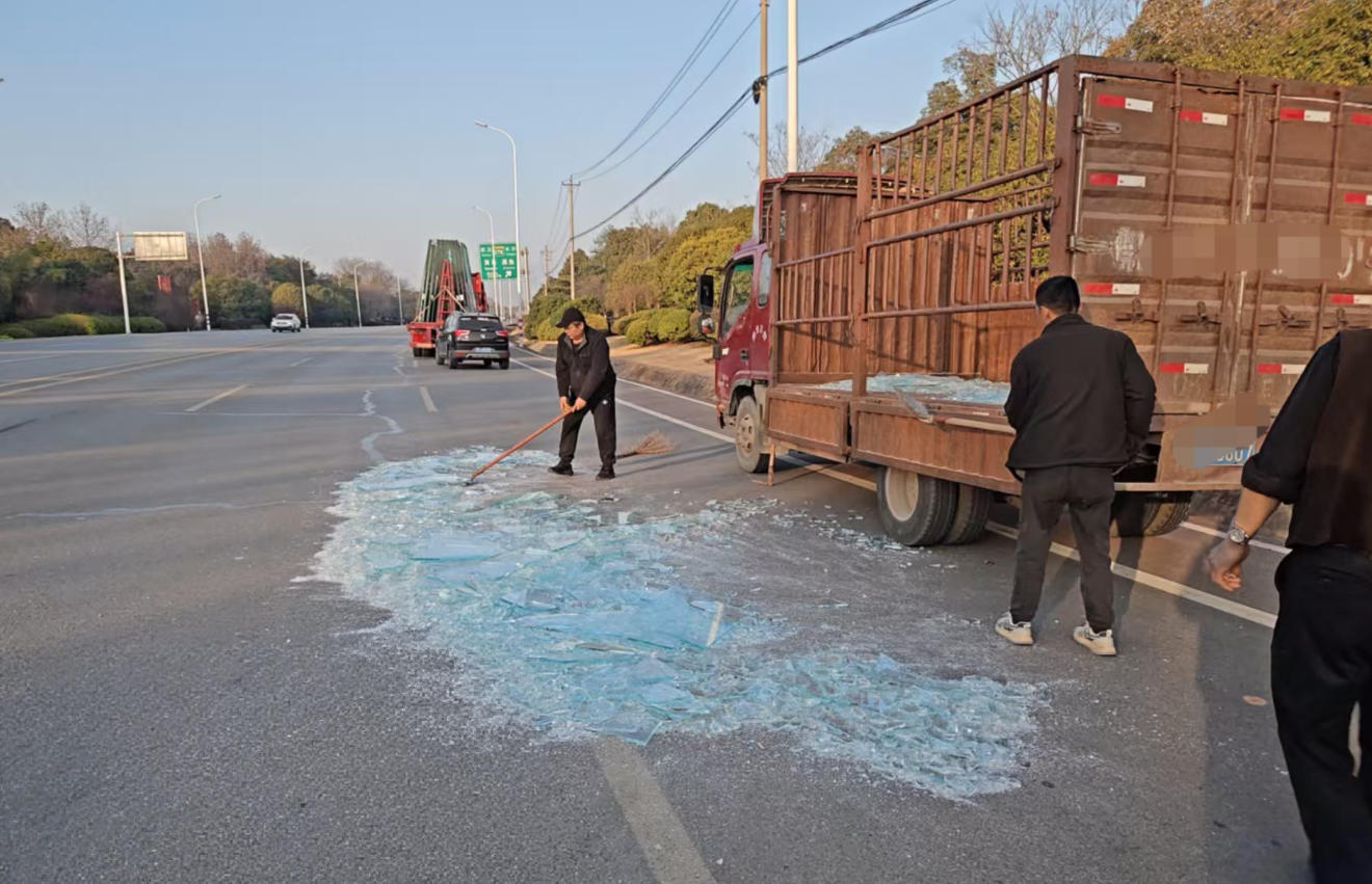 物流公司随即调配人员、车辆及工具抵达现场。在城管队员的督导下,工作人员细致清理路面,先归集大块玻璃,再捡拾细小残渣,最后用高压水枪全面冲洗,确保不留安全隐患。经过两个多小时作业,玻璃碎渣全部清运处置完毕,道路恢复整洁畅通。