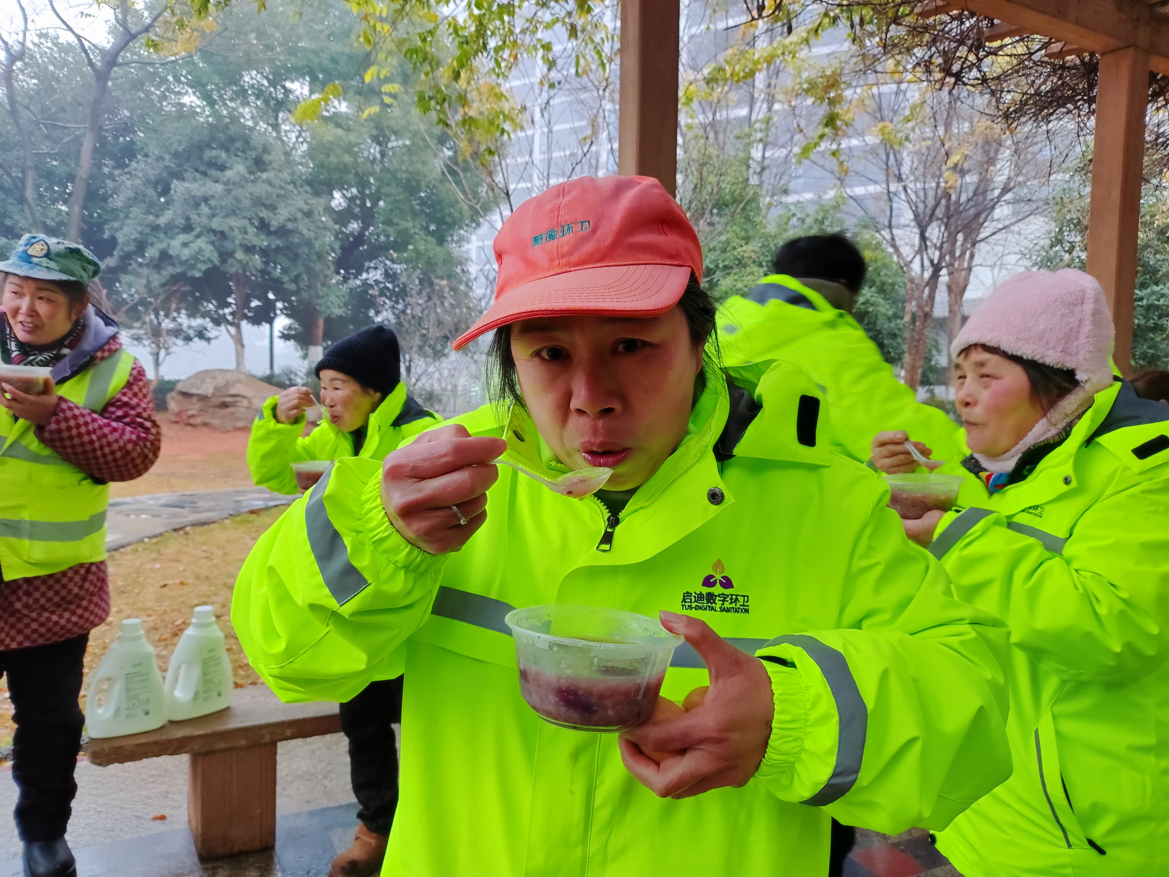 一碗融合了花生、红枣、桂圆等食材的香甜腊八粥,不仅驱散了深冬的寒意,更拉开了农历新年的序幕,传递着“粥到暖人心”的浓浓情意。活动现场,志愿者们将一份份满载心意的慰问礼包递到环卫工人手中。