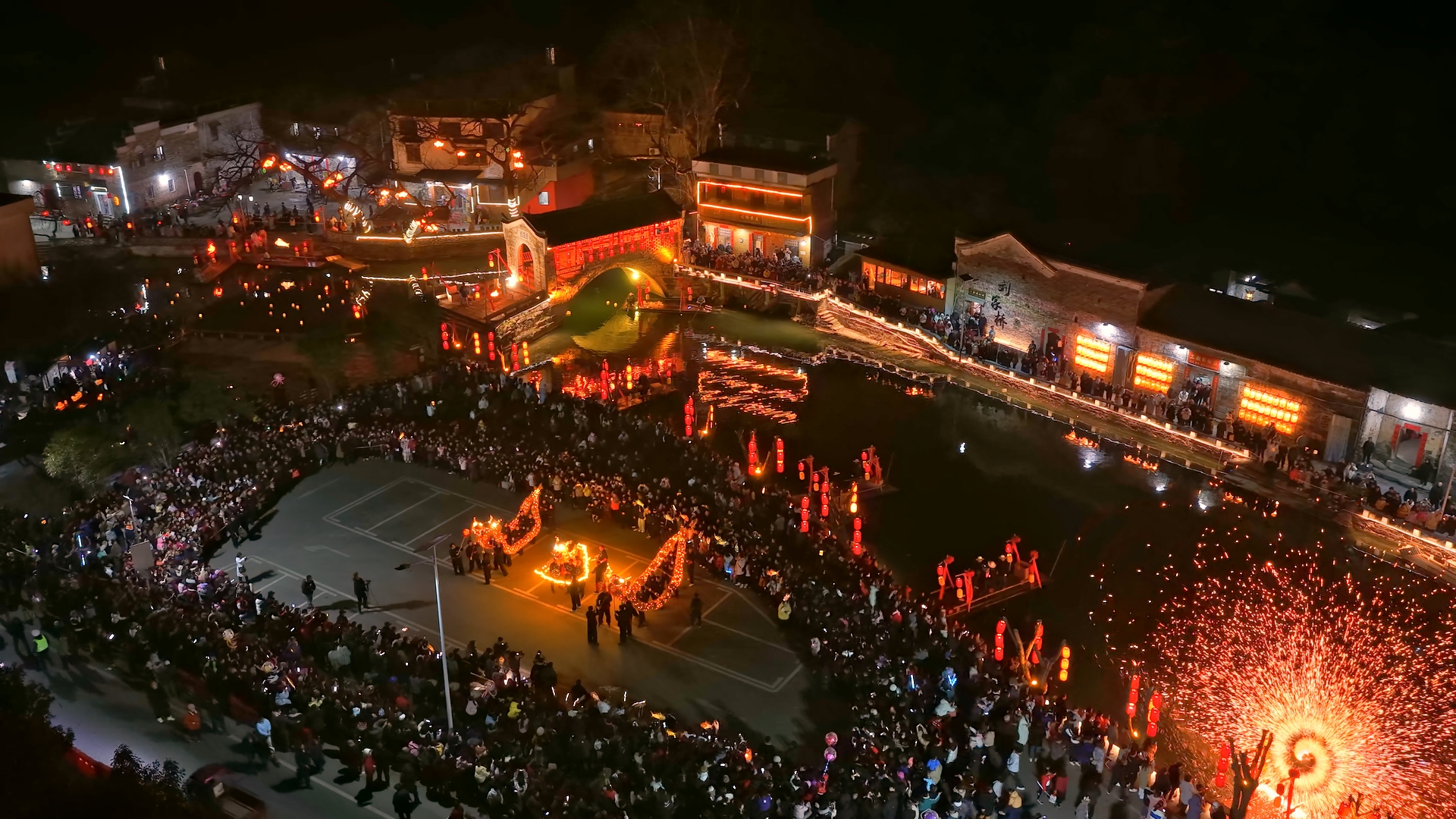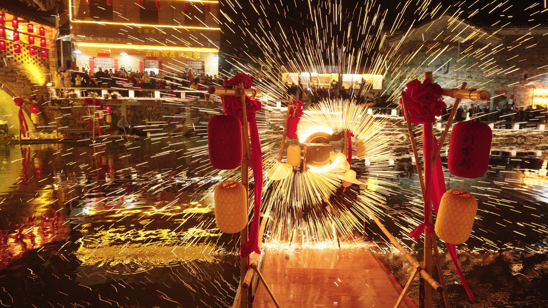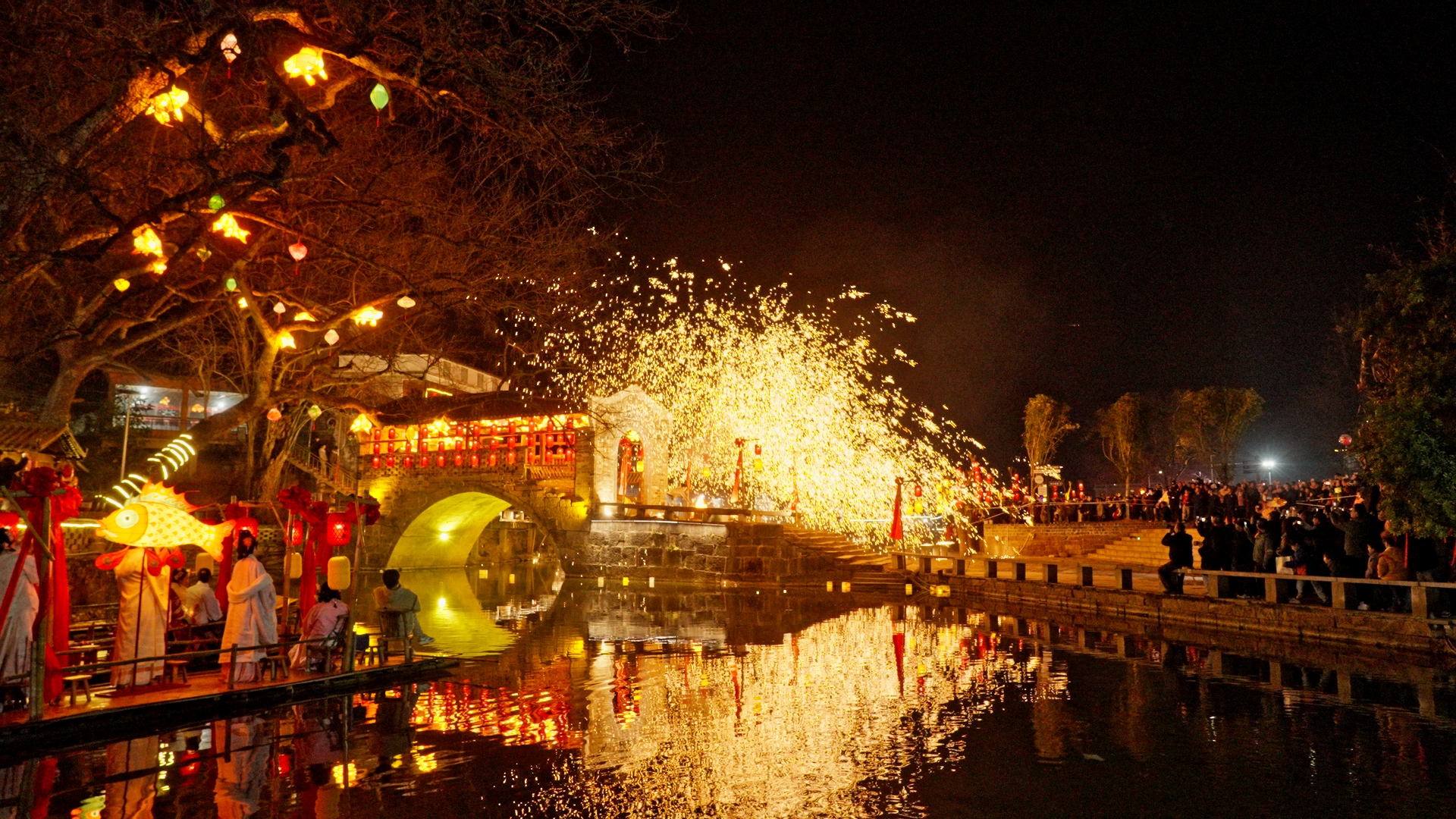 巡游结束后,舞龙队员们献上精彩展演。盘龙、游龙、穿腾、翻滚……一连串高难度动作行云流水。“金龙”时而昂首冲天,时而低回戏水,栩栩如生。活动现场还同步开展汉服巡游、打铁花、水上火舞、放河灯等特色活动。在“打铁花”表演中,滚烫的铁水经奋力击打,瞬间化作漫天璀璨金雨,与此同时,乘着竹筏的表演者在水中同步舞动起燃烧的钢丝棉,划出一个个灵动耀眼的光环。金龙、铁花与朦胧夜雾交织,营造出浪漫而喜庆的节日氛围。