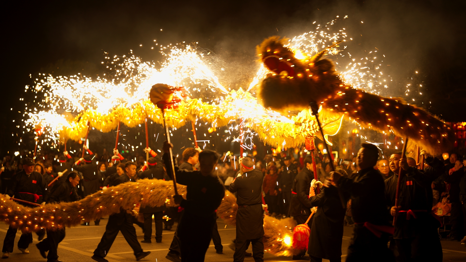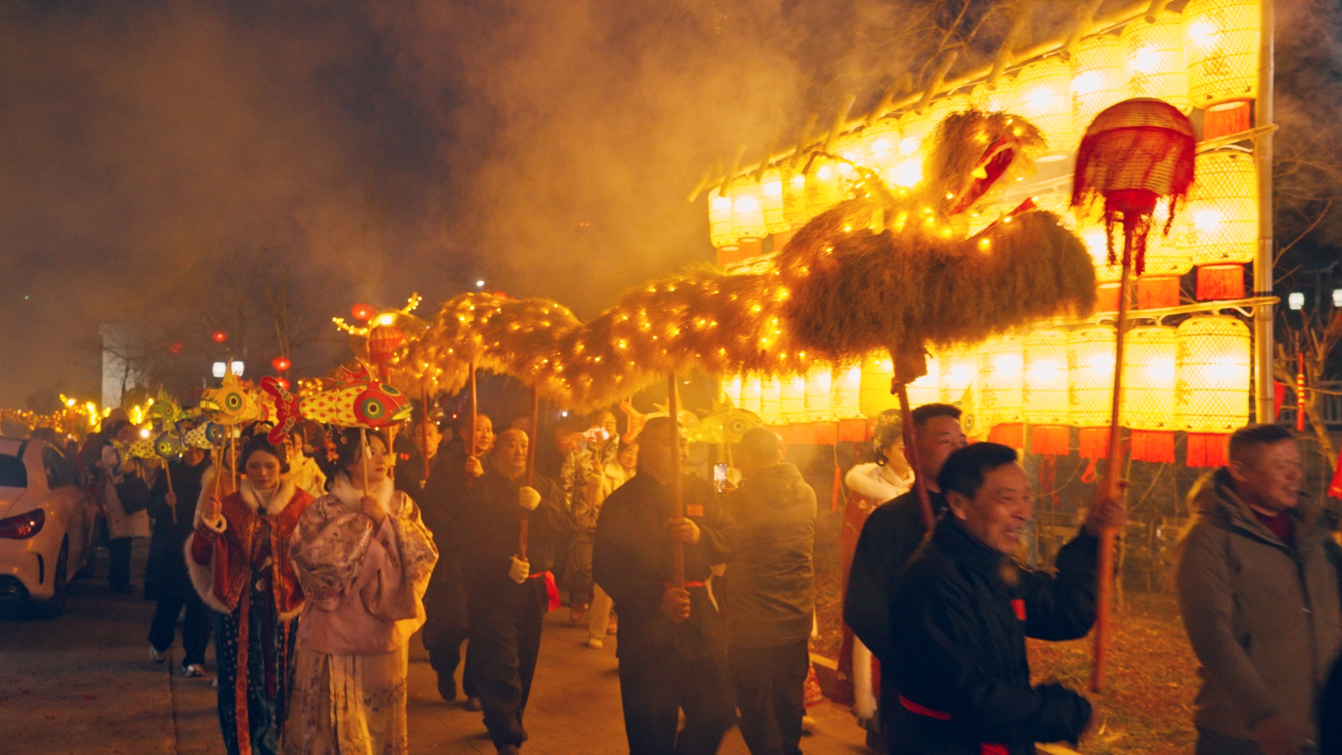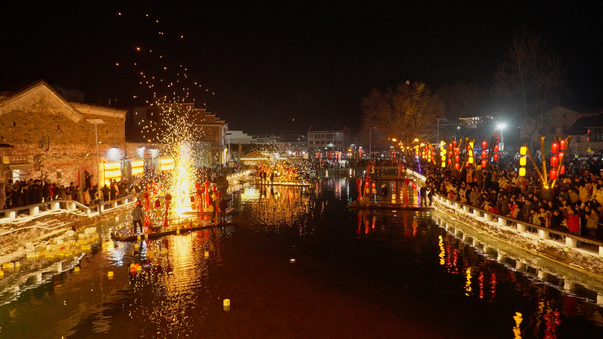 巡游结束后,舞龙队员们献上精彩展演。盘龙、游龙、穿腾、翻滚……一连串高难度动作行云流水。“金龙”时而昂首冲天,时而低回戏水,栩栩如生。活动现场还同步开展汉服巡游、打铁花、水上火舞、放河灯等特色活动。在“打铁花”表演中,滚烫的铁水经奋力击打,瞬间化作漫天璀璨金雨,与此同时,乘着竹筏的表演者在水中同步舞动起燃烧的钢丝棉,划出一个个灵动耀眼的光环。金龙、铁花与朦胧夜雾交织,营造出浪漫而喜庆的节日氛围。