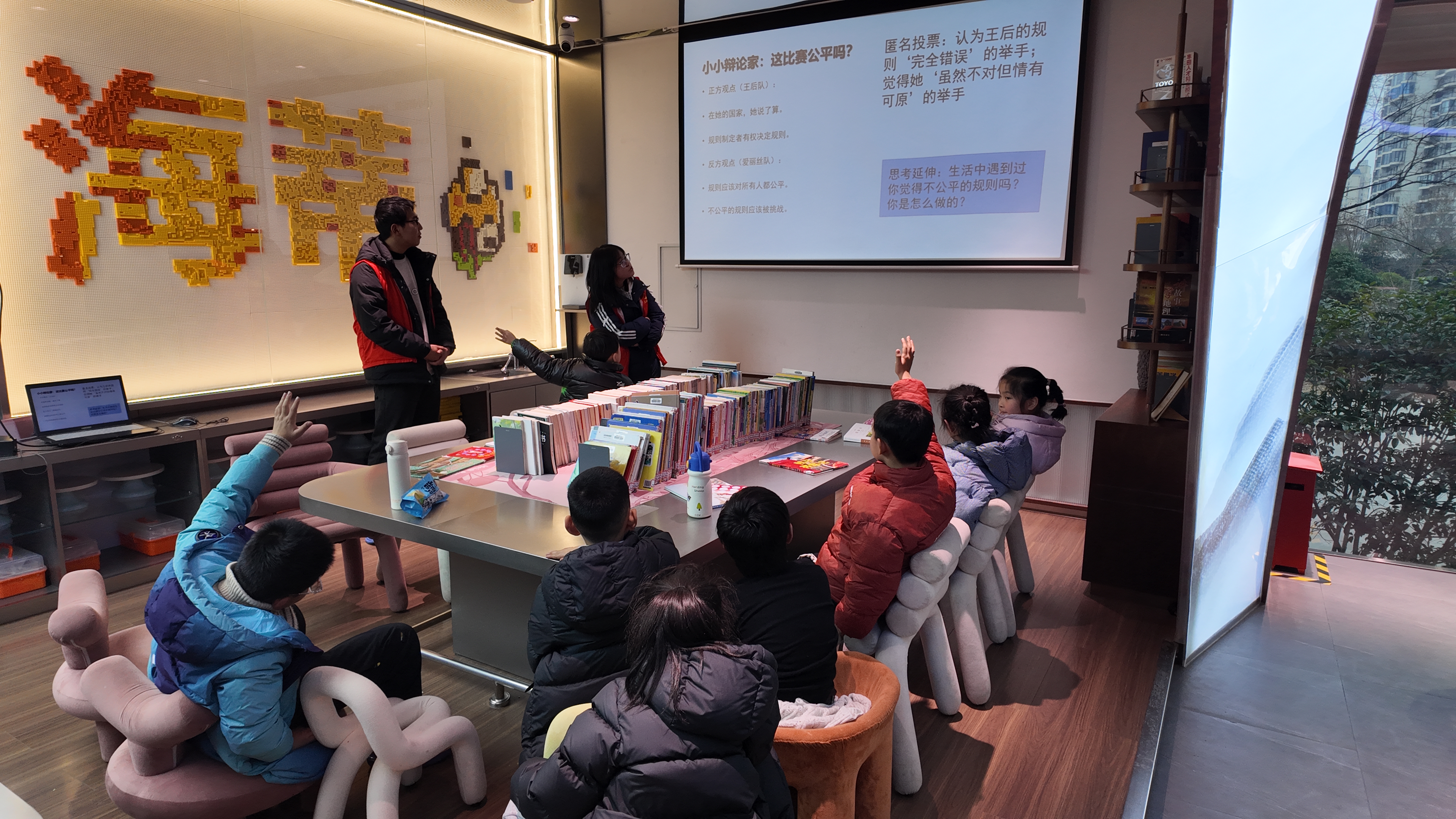 这不是一节传统的阅读课,而是一场可听、可论、可创造的寒假奇遇。除了跟随志愿者老师对绘本的探索,孩子们还在“疯狂茶会接龙”中发挥想象,在“槌球赛公平辩论”中学习表达与倾听,通过对比影视版本中的爱丽丝,他们讨论勇气与成长,并将这些话题与自己的寒假生活相联系。