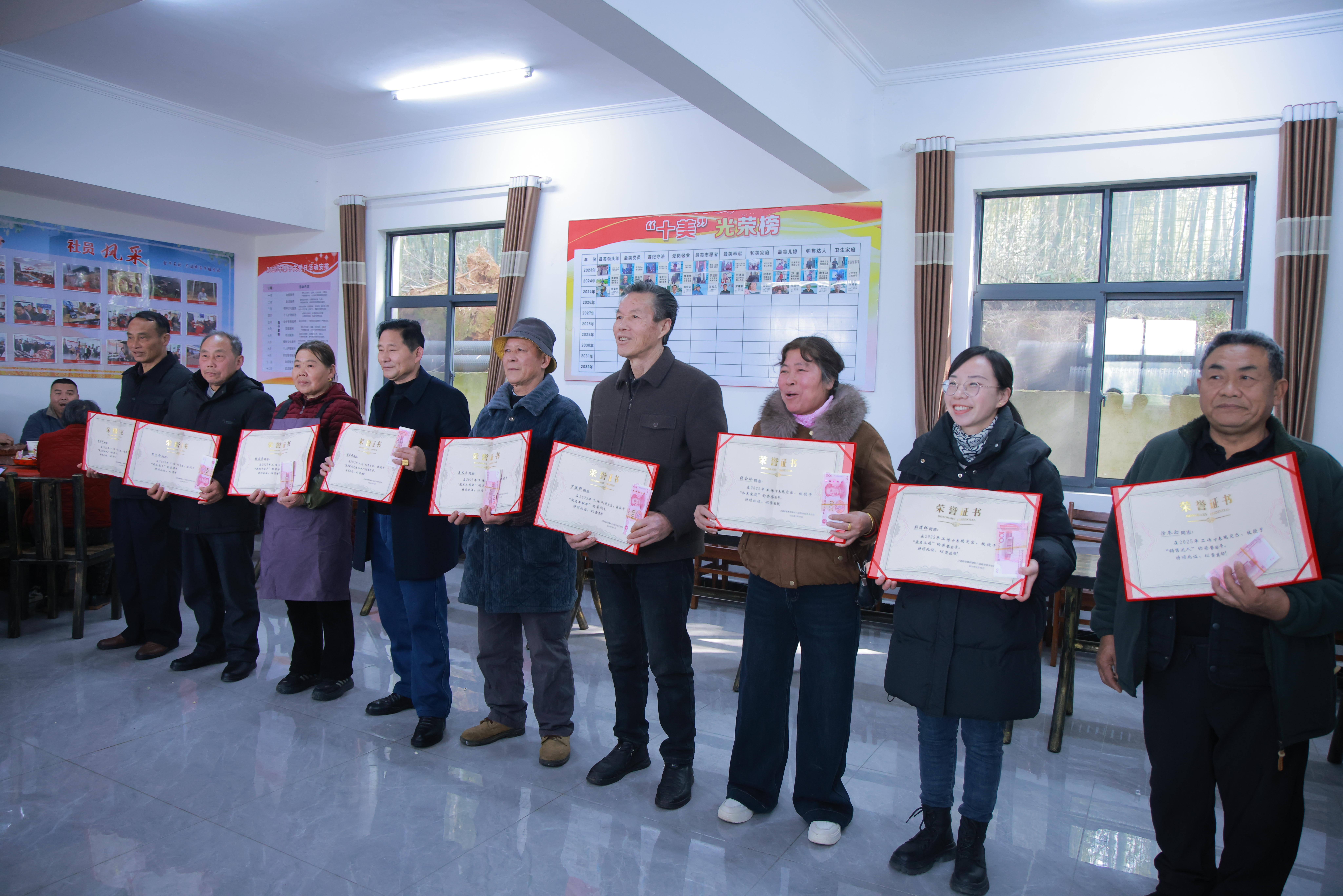 领奖环节更是让全场鼓掌。10位村民走上前领取“十美”荣誉证书,每人还能领到2000元奖金。这份荣誉,是对他们日常付出的最高认可,也点燃了全场人共创美好的信心。