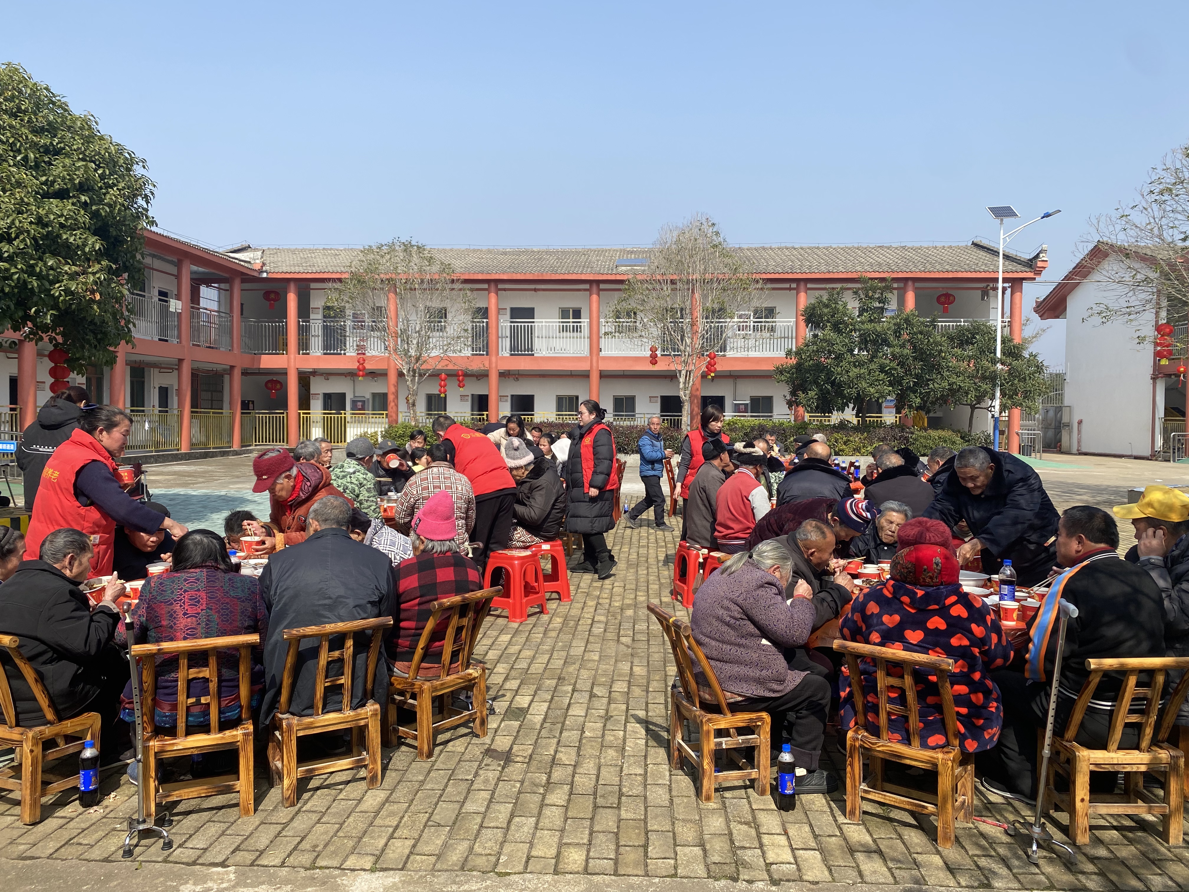 当天,记者走进双溪桥镇福利院,映入眼帘的是喜庆的红灯笼,40余位老人围坐在餐桌旁,脸上写满期待。