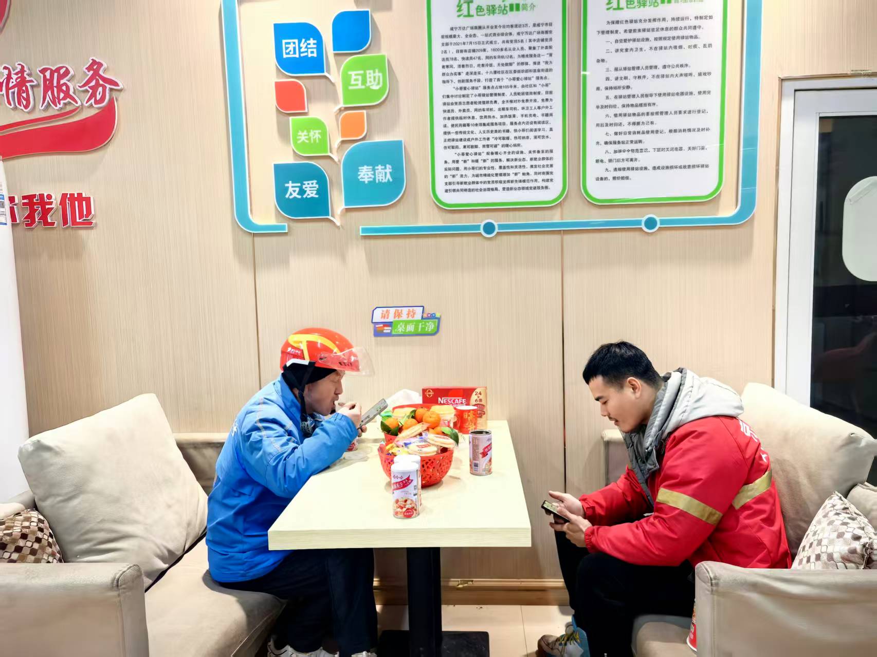 在驿站的茶几上,整齐摆放着精心准备的“新春能量补给”——热气腾腾的热饮、香甜的糖果、酥脆的饼干、寓意平安的苹果……所有物资均免费供应,随取随用。“师傅,进来喝杯热茶,吃点糖果再走!”工作人员热情地招呼着路过的外卖小哥。刚送完一单的外卖小哥小张停好电动车,搓了搓冻红的双手,接过热茶一饮而尽。