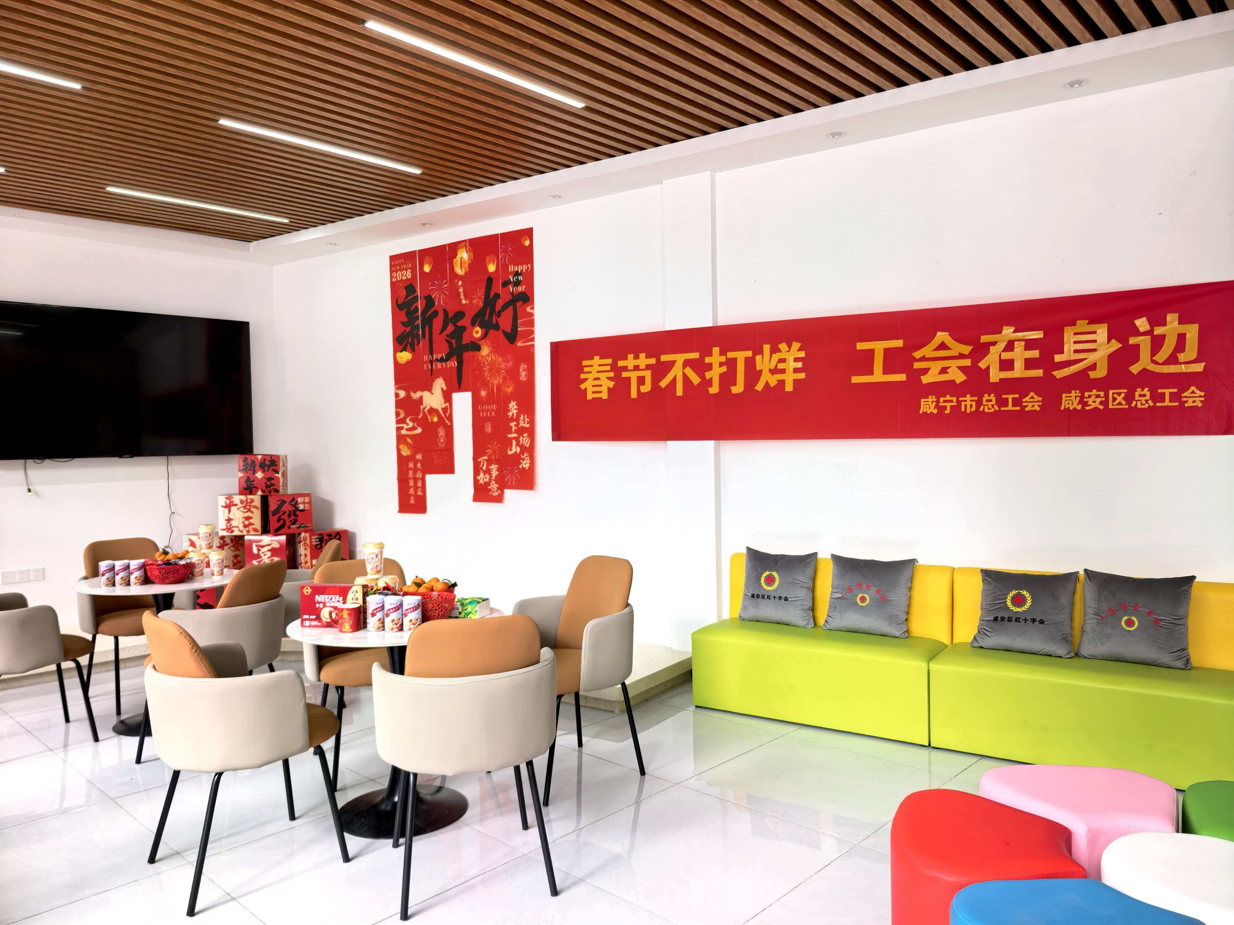走进万达商圈工会驿站,红彤彤的对联贴起来了,寓意吉祥的“福”字摆起来了,喜庆的拉花在灯光下摇曳生姿。平日里功能齐全的休息场所,在工会志愿者的精心装扮下,摇身变成了年味十足的“暖心小屋”。