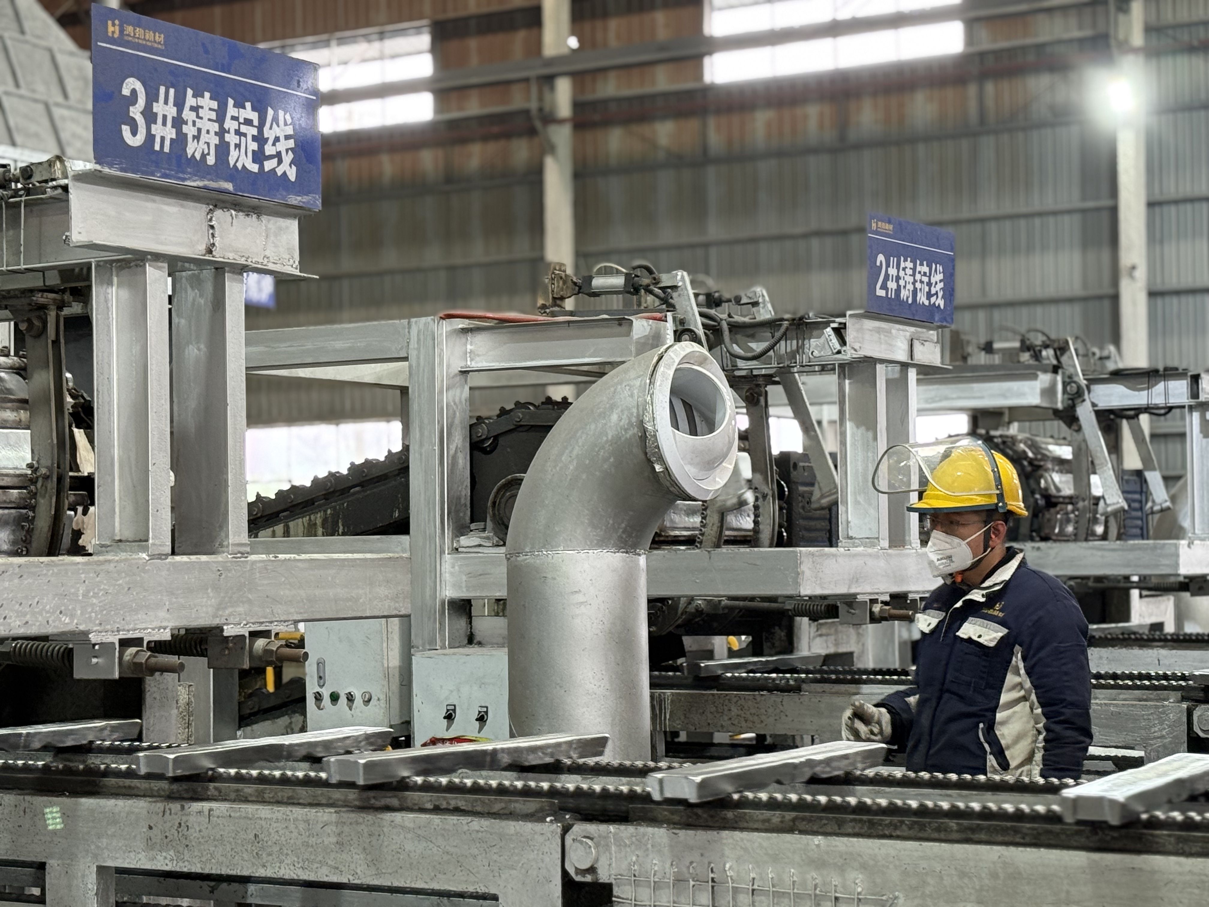 正月初九,湖北华劲铝业有限公司的熔铝车间炉火正红。巨大的机械臂精准投料,工人们专注地浇铸铝锭,一摞摞银光闪闪的产品整装待发。