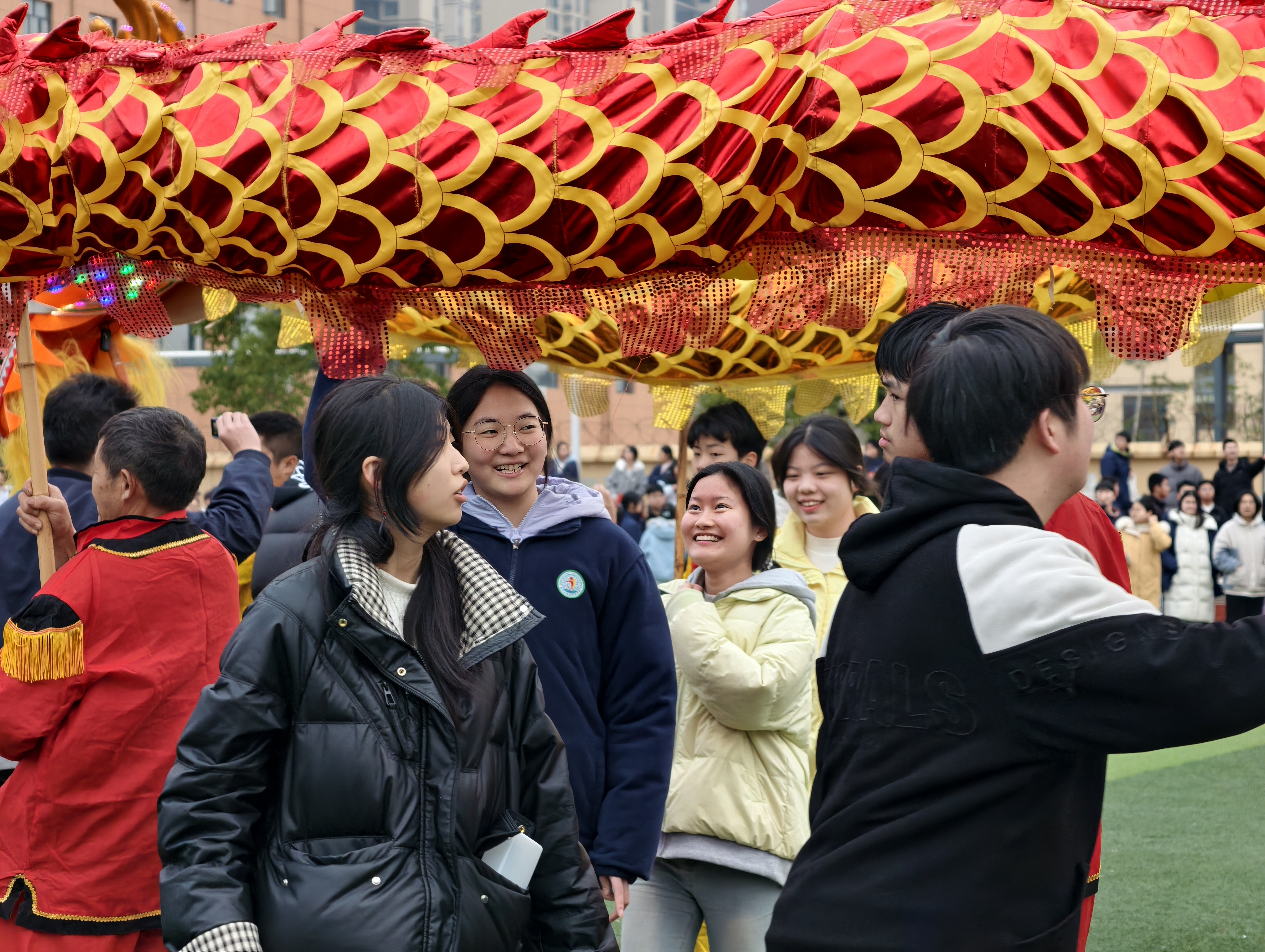“舞龙时,龙头要紧随龙珠灵动游走、步步追逐,龙身随龙头自然起伏、连贯摆动。大家动作要舒展大方、协调流畅,这样才能显示出龙的气势与灵动神韵。”现场,舞龙艺人手把手为同学们示范要领、传授技巧,让大家亲身参与舞龙体验,共庆佳节。在喜庆热烈的氛围中,同学们真切感受着传统民俗文化的独特魅力。