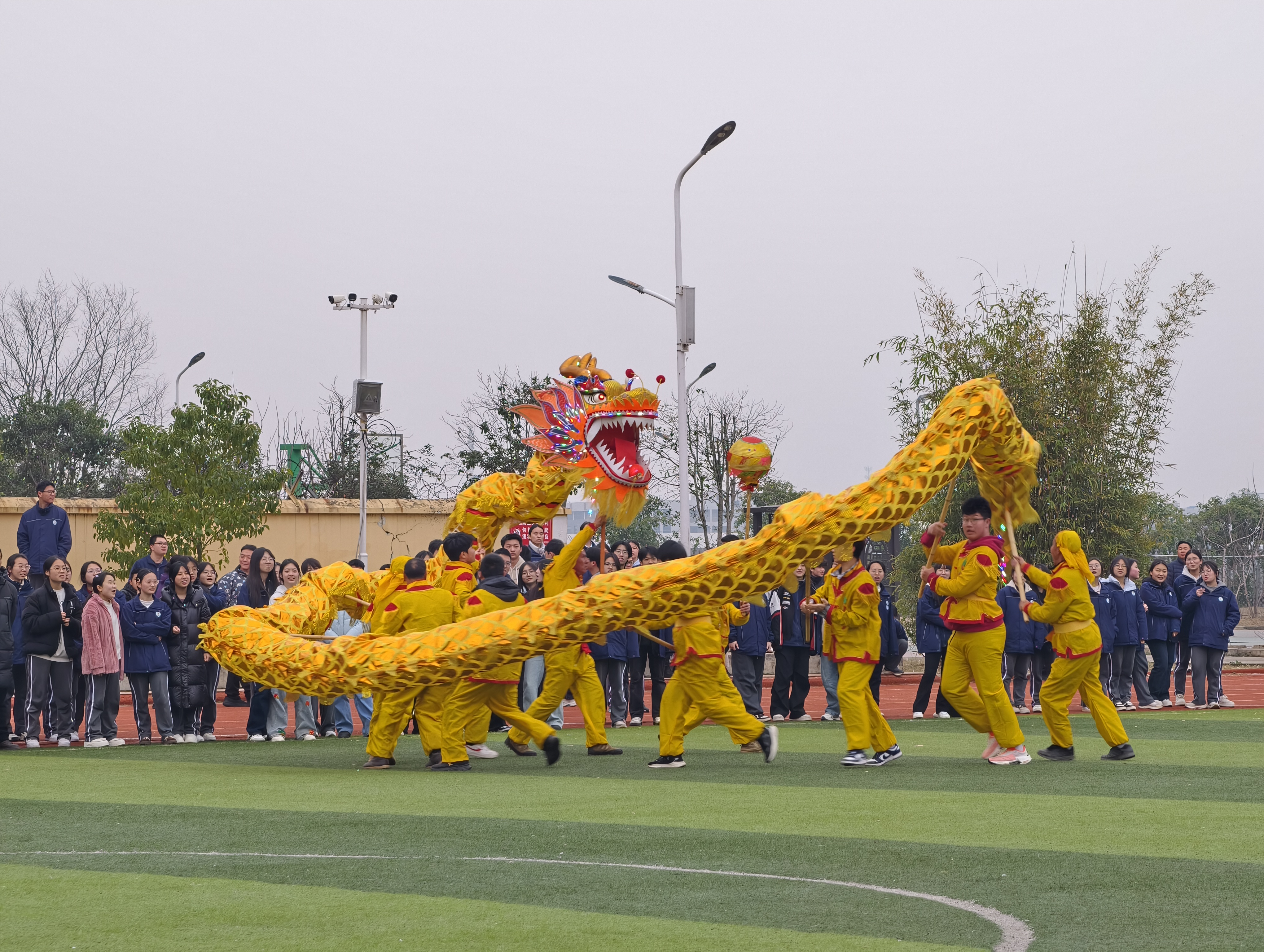 活动现场,来自高桥镇的专业舞龙队浩荡入校,激昂的锣鼓声、唢呐声瞬间点燃校园氛围。两条彩色长龙在文化长廊、体育馆、食堂、宿舍及各班教室间穿梭游走,身姿矫健灵动。随后,舞龙队在操场进行集中展演,只见两条金黄相间的巨龙在操场中央腾空而起,龙珠引路,龙身翻腾,十余位身着统一服装的表演者配合默契,步伐矫健有力。时而快速穿梭,似蛟龙破浪前行;时而盘旋环绕,形成层层叠叠的“龙阵”,每一个动作都行云流水、刚劲有力,将龙的灵动与威严展现得淋漓尽致,引得现场师生阵阵欢呼、拍手叫好。