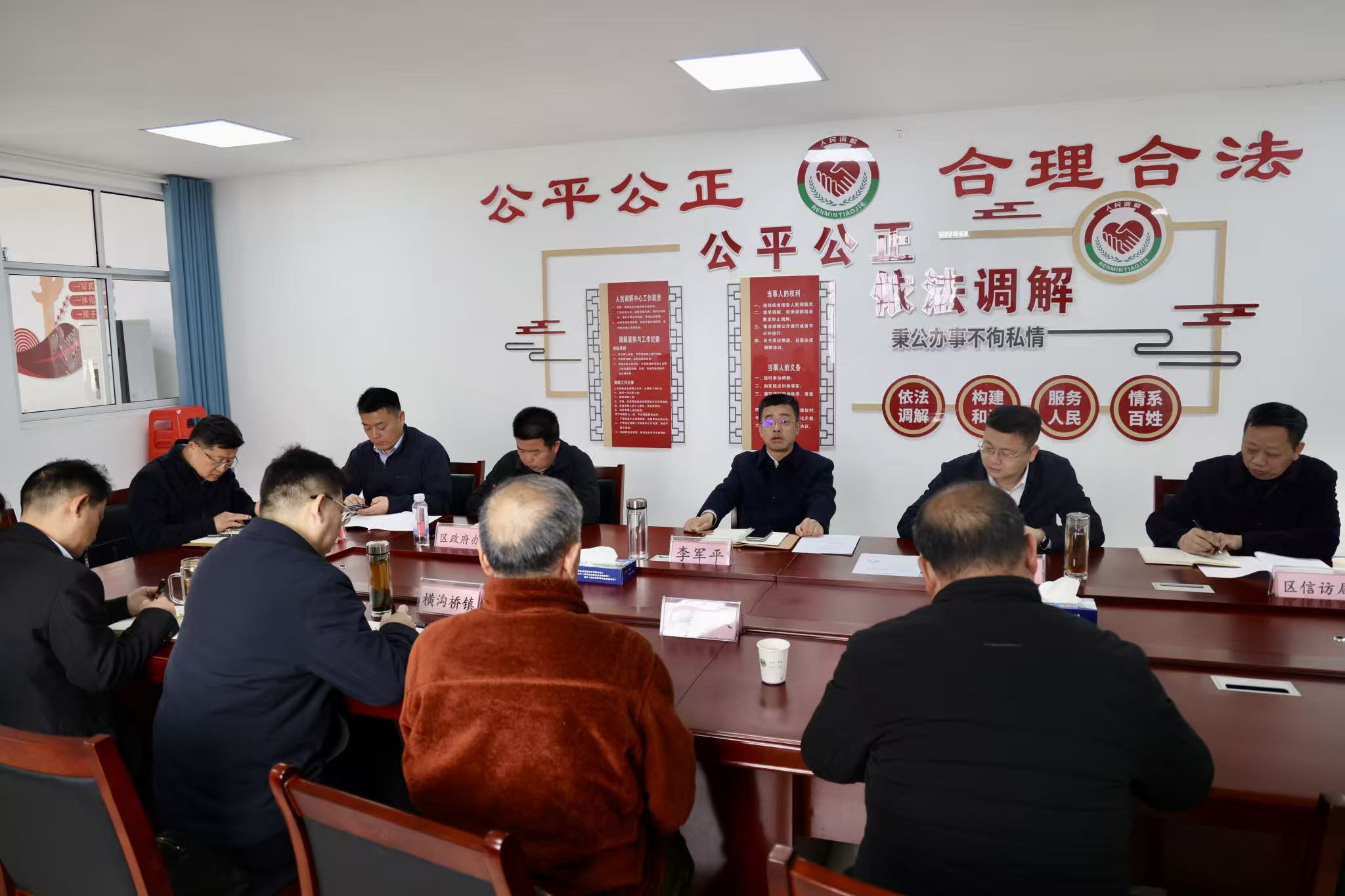 在横沟桥镇综治中心,李军平现场接待两批来访群众,实地了解信访事项背景情况,针对群众提出的邻居建房时将其房屋主房推倒并占用他家面积等问题,李军平认真倾听、详细记录群众具体诉求,与属地镇、村及区城管执法局等相关部门负责人现场会商,逐一研究解决方案,明确责任单位、化解时限和工作要求。