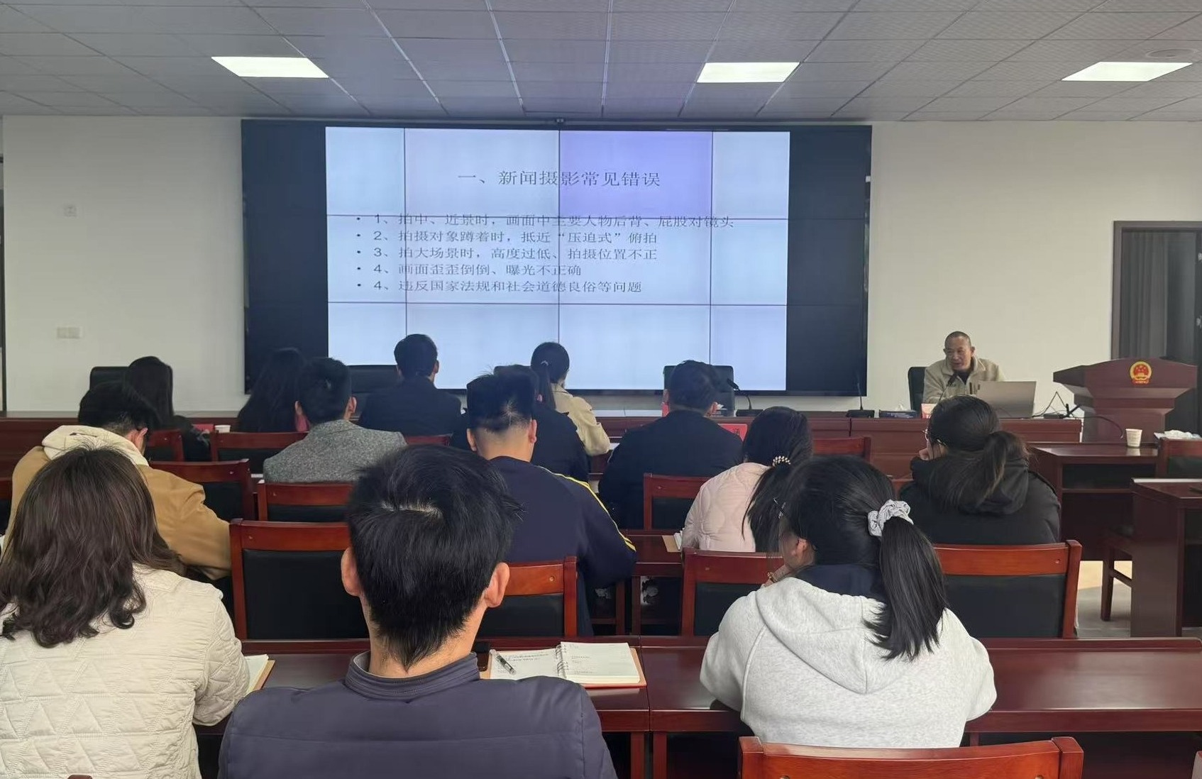 吴涛以《新闻拍摄技巧与应用》为题,分享了新闻摄影的基础常识和实战经验。通过数百张图片的对比展示,直观讲解了新闻摄影的常见错误、拍摄禁忌和实用技巧。他从如何正确构图、如何让画面饱满,到如何抓拍精彩瞬间,深入浅出地传授了新闻摄影的方法与心得。