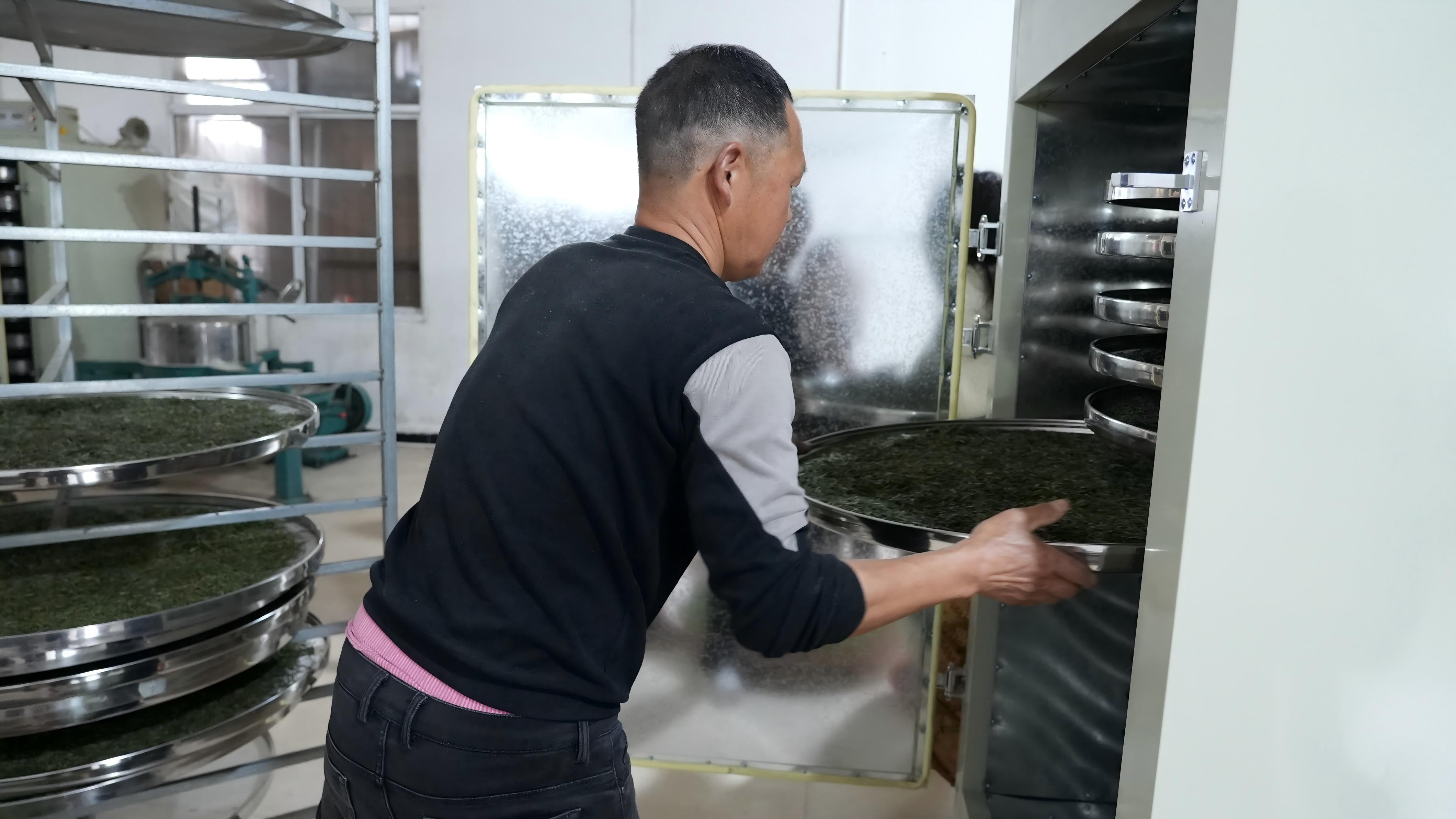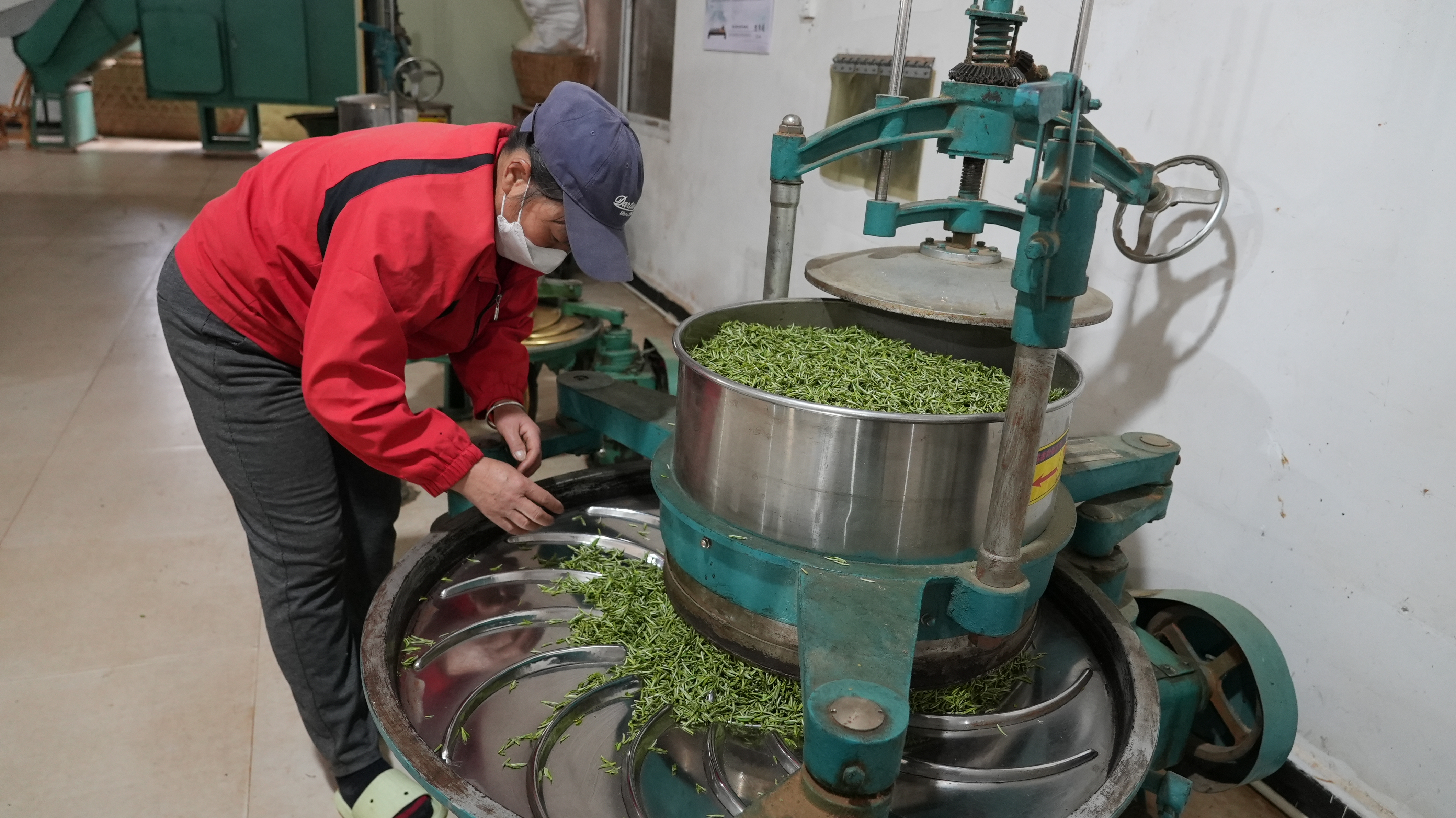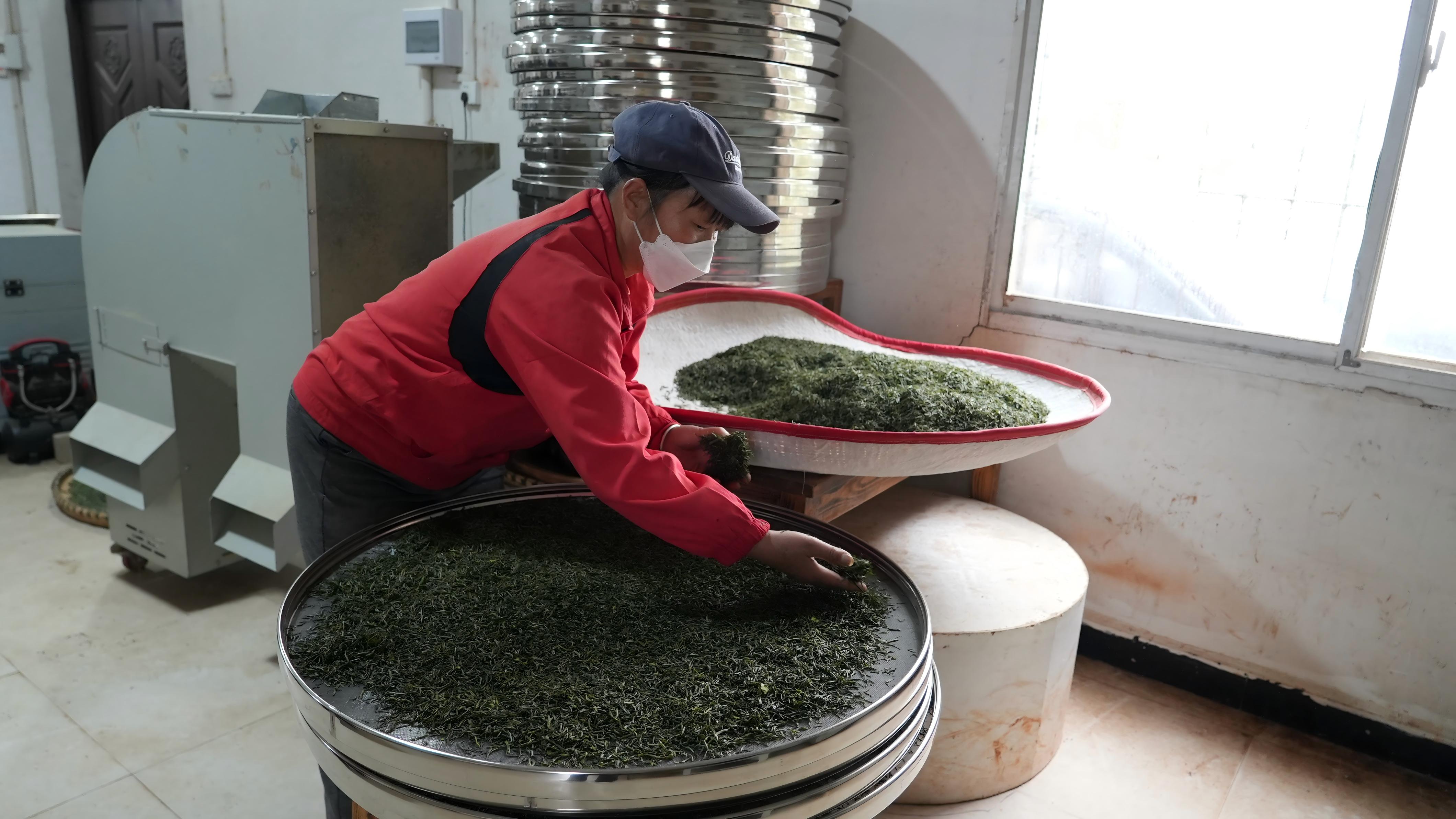 走进制茶车间,茶香四溢。刚采摘下来的鲜叶被均匀摊放在架子上,在这里经历8到10个小时的萎凋,直到青草气散失、茶香气显露。随后,茶叶被送进温度高达300℃的杀青机进行杀青,再经过揉捻、理条、烘干等工序,最终制成成品。