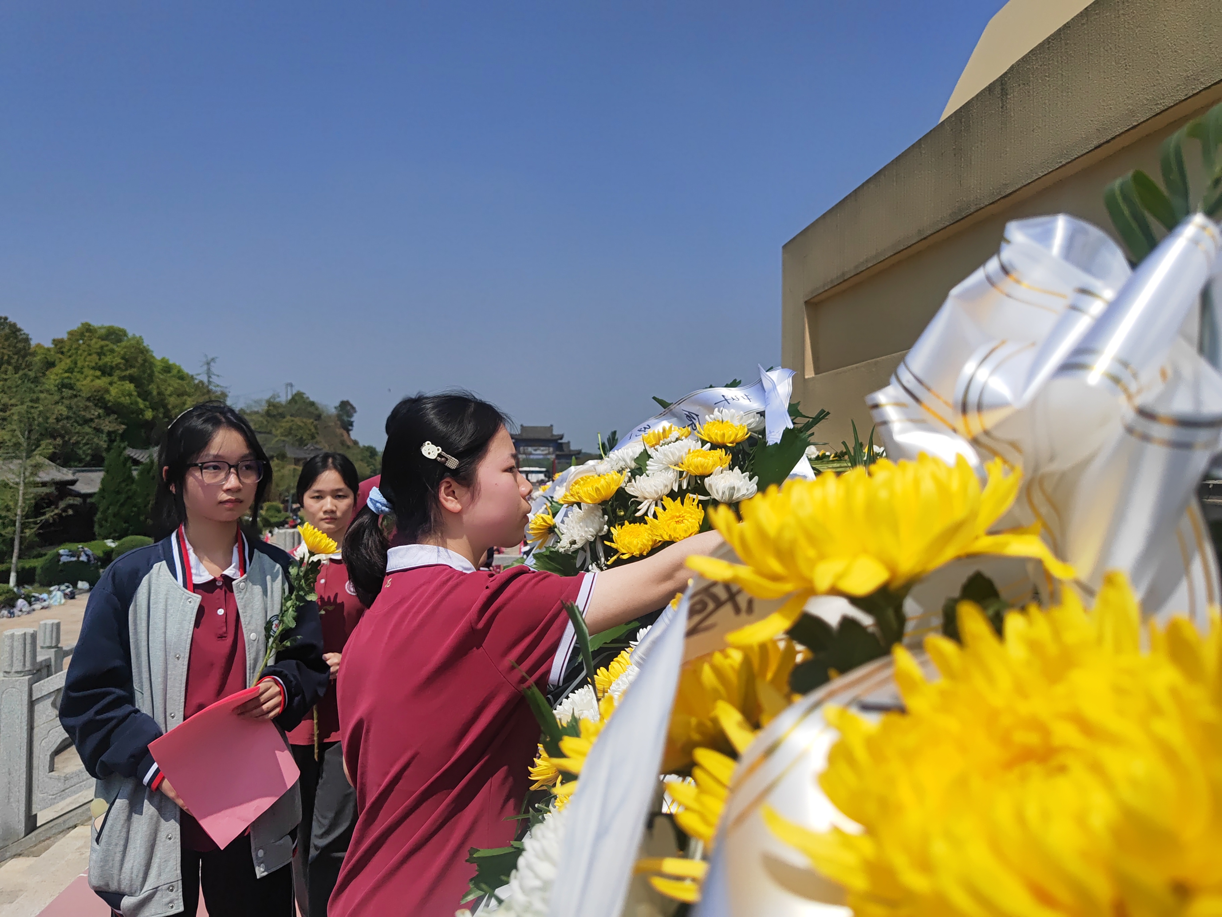 该校校长缓步上前,仔细整理花篮缎带;学生代表依次敬献鲜花,朵朵白花寄托着对先烈的无尽追思。