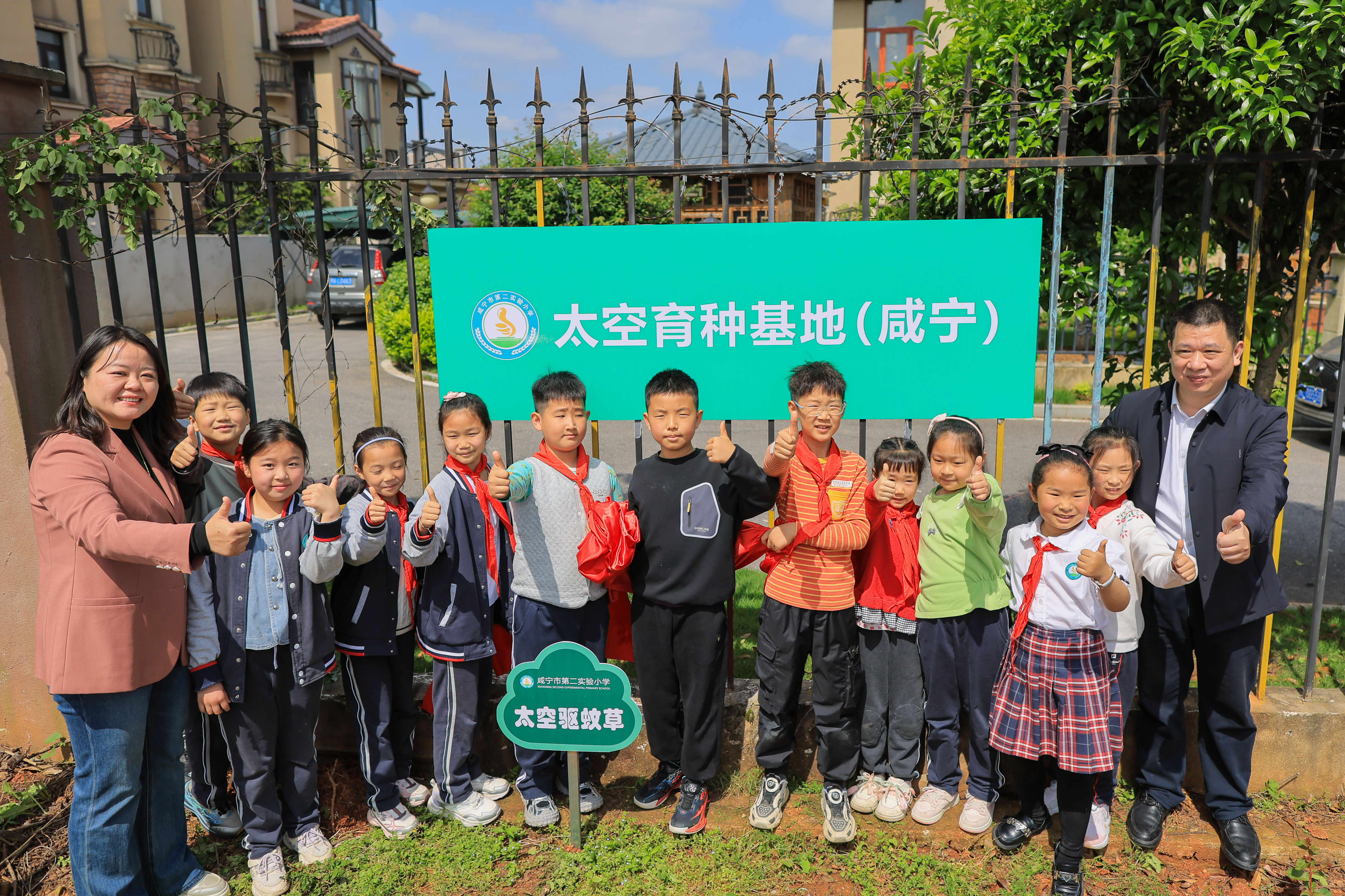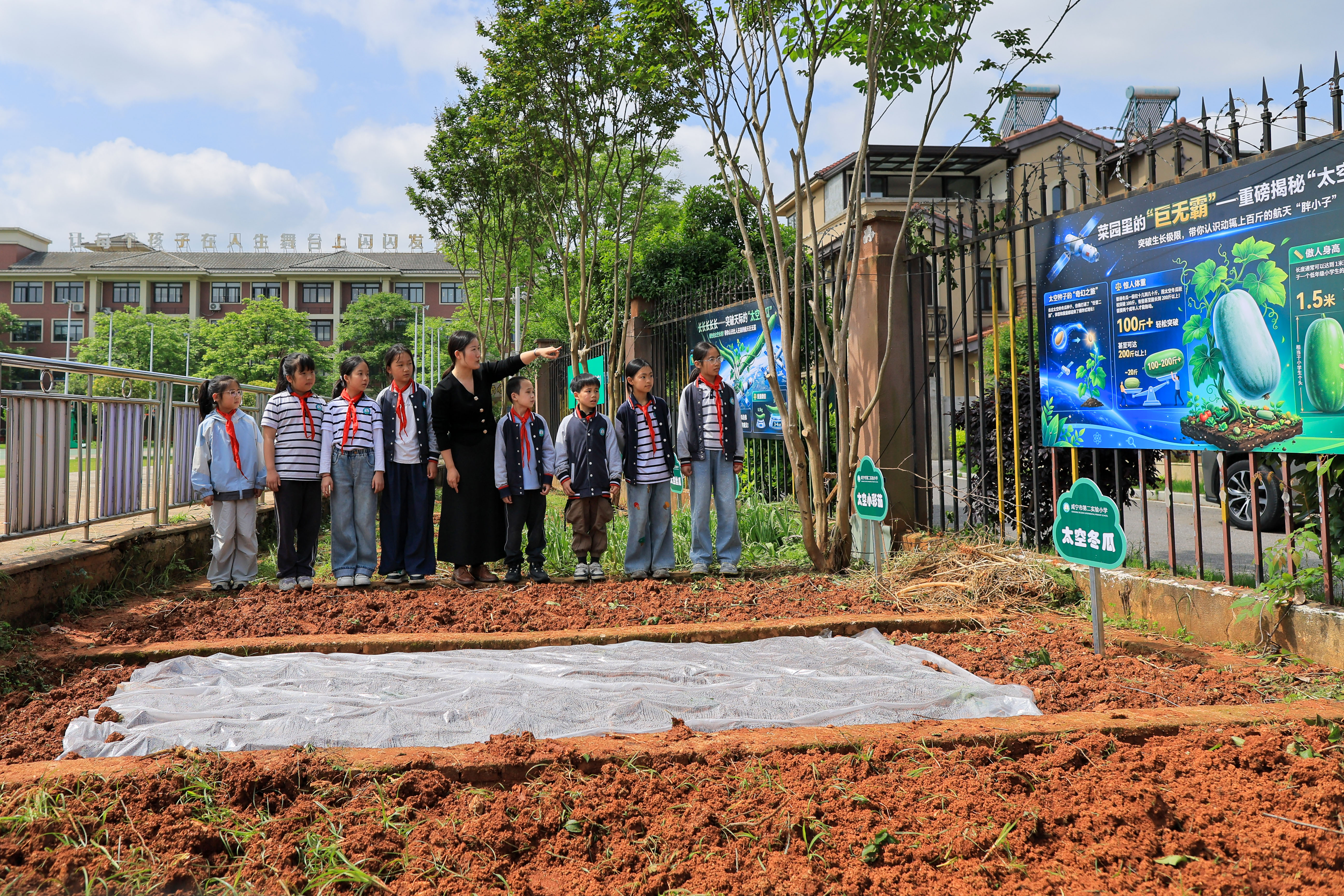 区教育局党组副书记沈海林和校长谭璐带领学生代表将红绸揭开,“太空种子种植基地(咸宁站)”正式落地,标志着这些曾经历空间站特殊环境诱变的种子将在校园开启生命新旅程。