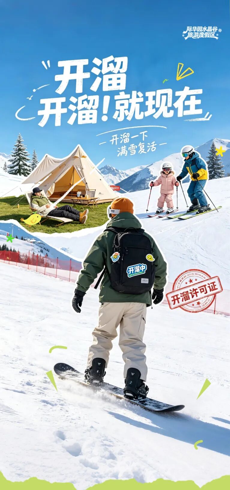 首届开溜活动惊喜上线,室内滑雪、亲子托管、露营休闲、趣味互动多元融合,打造滑雪+酒店+露营一站式微度假模式,遛娃与放松两不误。