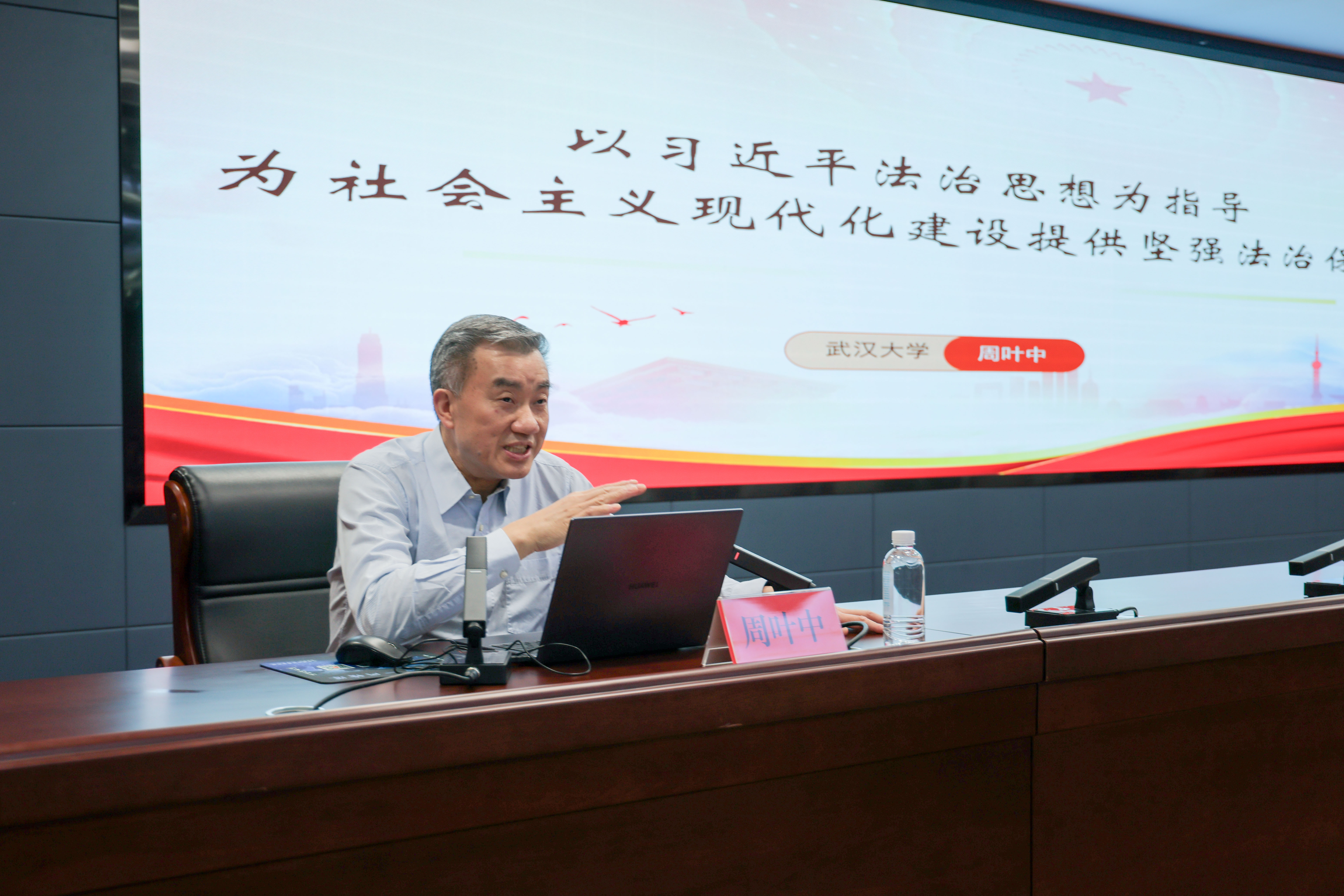周叶中教授紧扣理论内涵、结合实践案例,围绕《以习近平法治思想为指导,为社会主义现代化建设提供坚强法治保障》主题,从习近平法治思想是为社会主义现代化建设提供法治保障指南、系统把握习近平法治思想“十二个坚持”的主要内容、以习近平法治思想为指导,完善保障社会主义现代化建设的法治体系等三个方面进行了深入阐释。