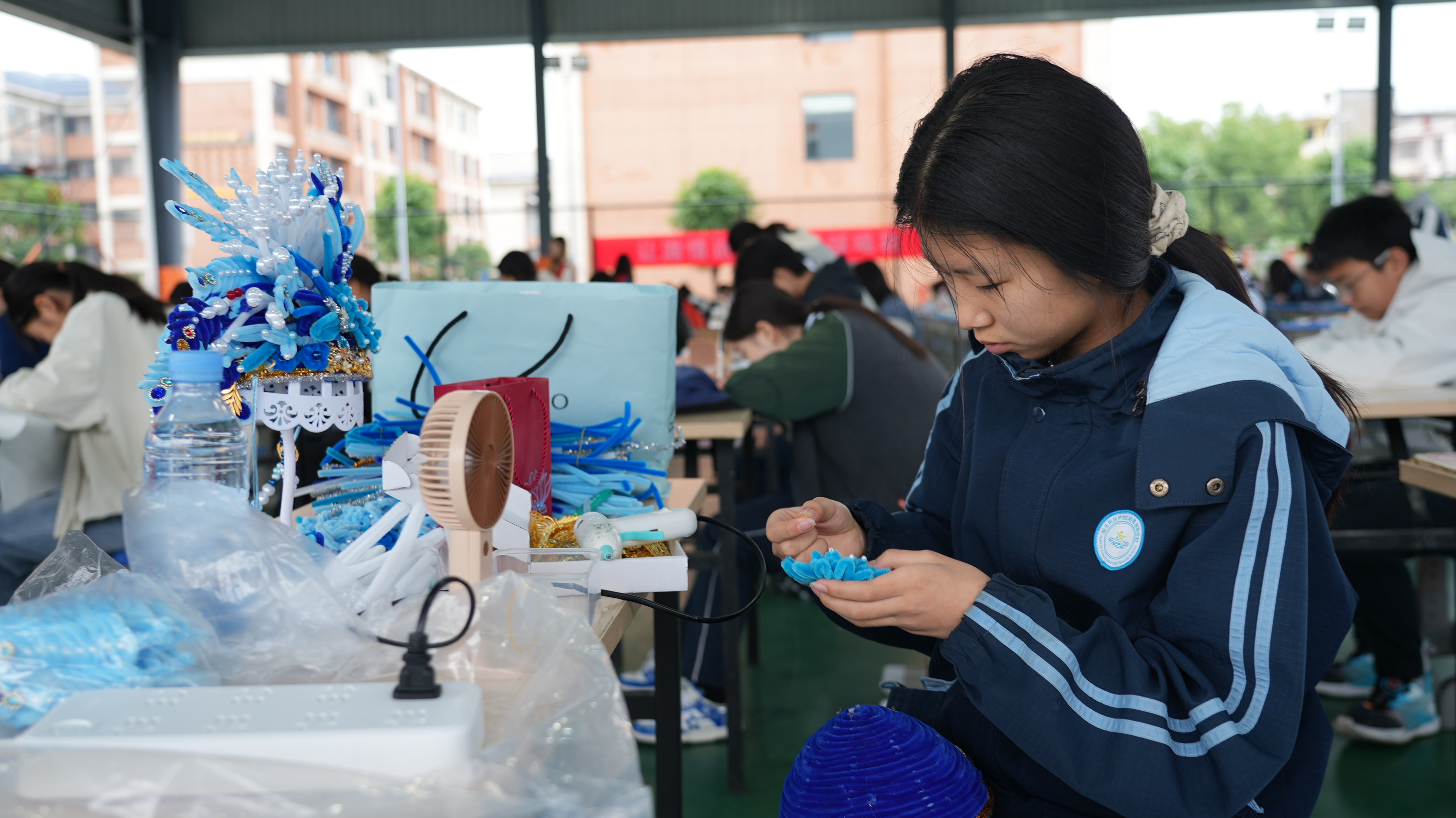 比赛分为绘画、书法、工艺作品三大类。在工艺作品区,湖北科技学院附属泉都学校初二学生查倩倩正专注地用扭扭棒制作一顶发冠,色彩鲜艳的扭扭棒在她手中翻转折绕,不一会儿,一朵精致的“桂花”便在发冠上绽放。“我设计的灵感来自咸安的桂花,想做一顶既有古风味道又带点现代感的发冠。”查倩倩笑着说,这是她第一次用扭扭棒做大件作品,既紧张又兴奋。