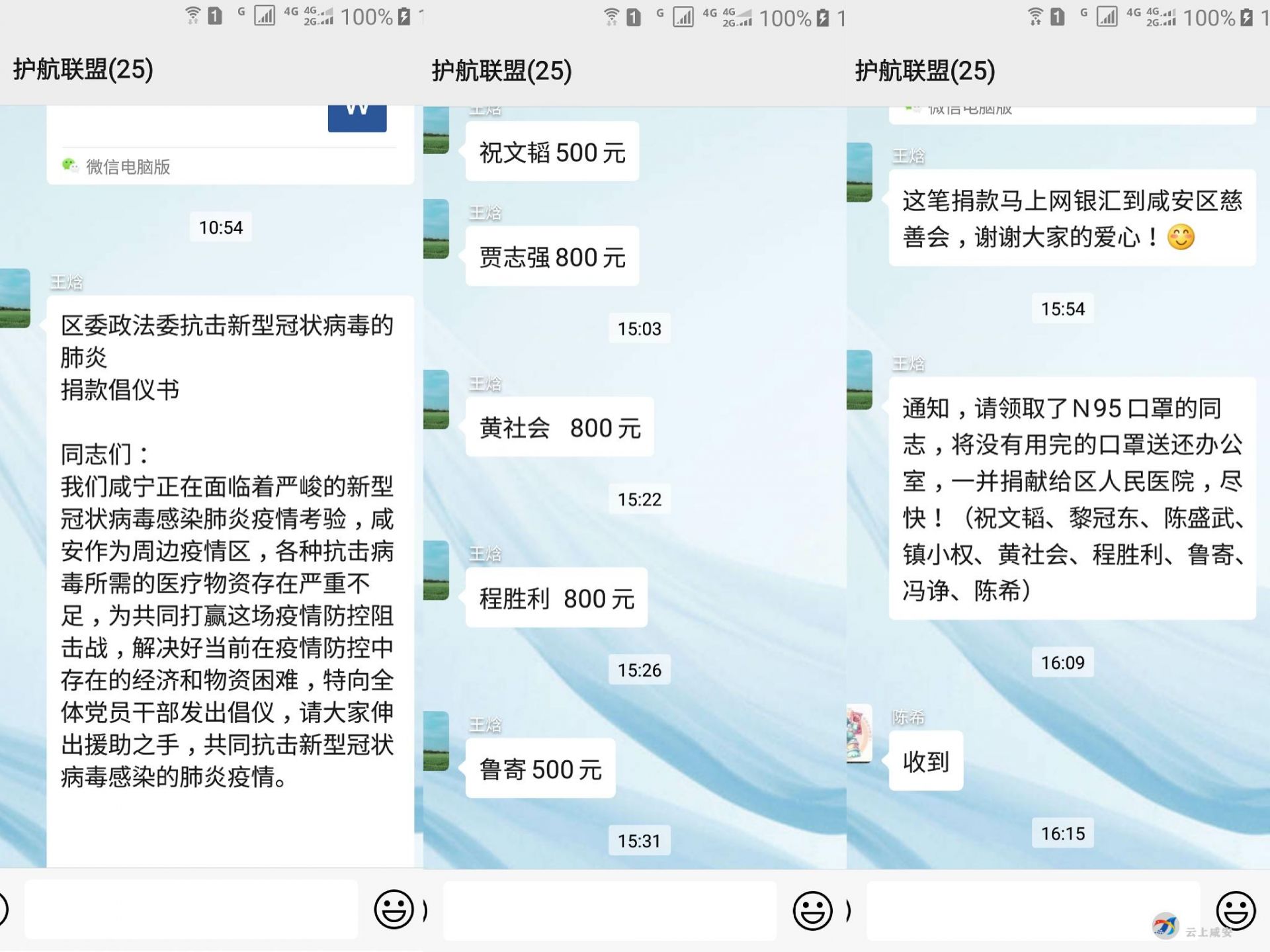 云上咸安报道(通讯员:陈洁琼) “为共同打好这场疫情防控阻击战,解决好当前疫情防控中存在的经济和物资困难,特向全体党员干部发出倡议……”2月4日上午,区委政法委微信工作群内一份捐款倡议书迅速拉开了一场“爱心红包”接力赛,全体党员干部踊跃捐款,用爱心善举履行社会责任,用实际行动助力抗疫。