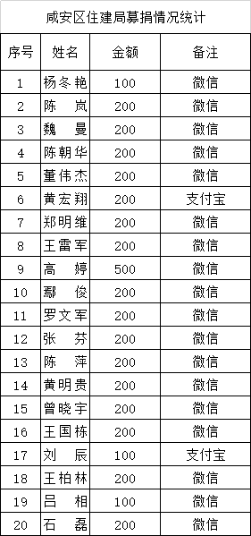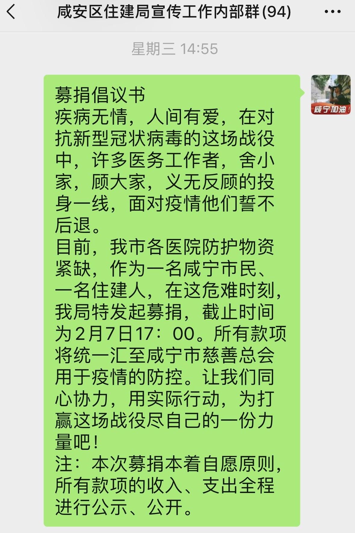 云上咸安报道(通讯员:董伟杰)“我捐款200元”、“我捐款500元”。为帮助打赢对抗新型冠状病毒的这场战役,区住建局机关团支部发起了专项募捐。短短两天时间,共有78名干部职工募捐善款16700元。