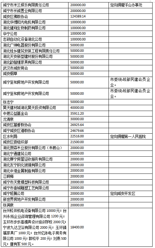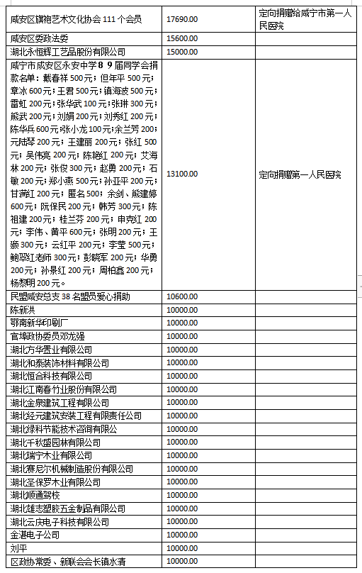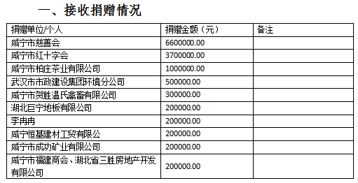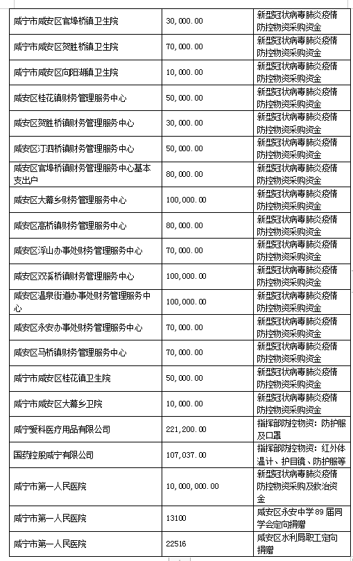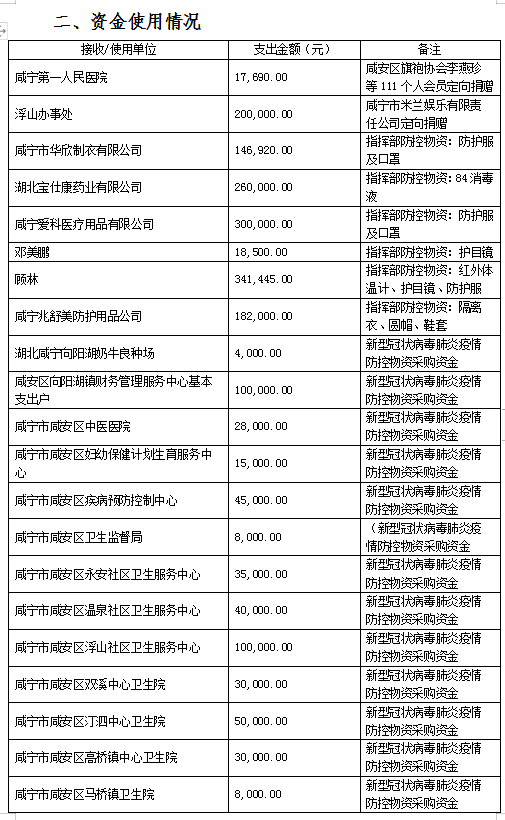 截止2020年2月11日24时,咸宁市咸安区慈善会收到“咸安疫情防控”捐赠款人民币共计15449288.96元,支出13293408元,结余2155880.96元(详见明细表)。