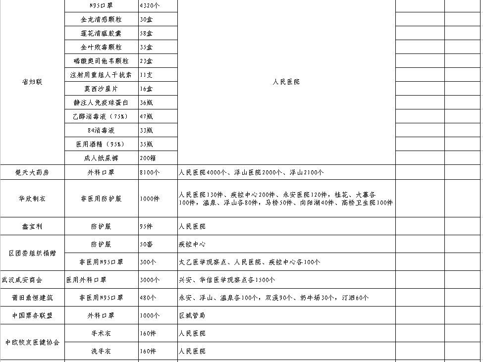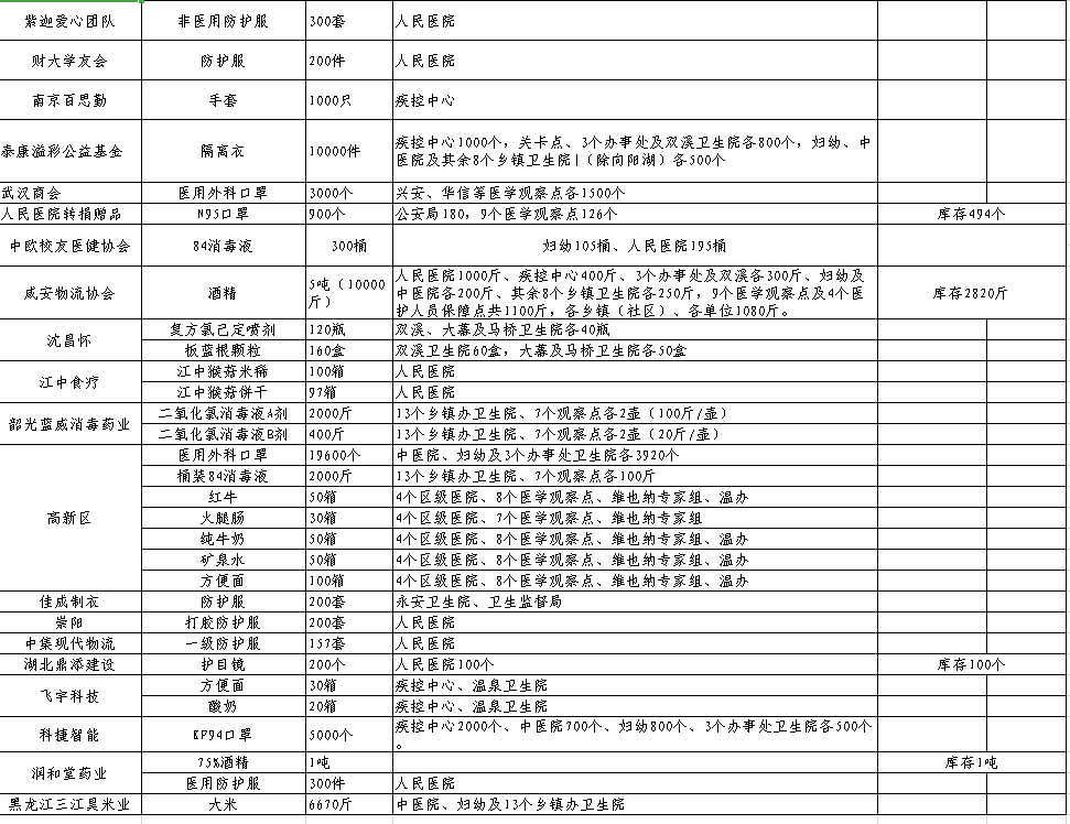 1、医用物资:外科口罩314700个,双氧水30吨,活性碳口罩40000个、一次性手套161000只、N95口罩7866个、KF94口罩5000个、防护服3725件,一级防护服157套,隔离衣20000件、隔离内服5400套、隔离服1500件、护目镜1600个、防护面罩499个,桶装医用酒精7820斤、桶装84消毒液2000斤,84消毒液33瓶、金龙清感颗粒30盒、连花清瘟胶囊58盒、金叶败毒颗粒35盒、磷酸奥司他韦颗粒23盒、注射用重组人干扰素11支、莫西沙星片16盒、静注人免疫球蛋白36瓶、乙醇消毒液(75%)47瓶、医用酒精(95%)35瓶、成人纸尿裤200箱、金银花口服液150箱、鱼腥草复合剂100箱、手术包160件、洗手衣160件。复方氯己定喷剂120瓶、板蓝根颗粒160盒,二氧化氯消毒液A剂2000斤,二氧化氯消毒液B剂400斤。