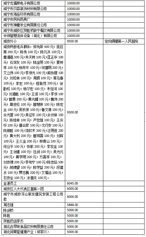 国家危难,匹夫有责;面对疫情,同舟共济;涓涓细流,汇成大爱!疫情发生以来,社会各界爱心如潮,关注、关心、支持咸安抗击疫情,慷慨解囊,无私奉献!