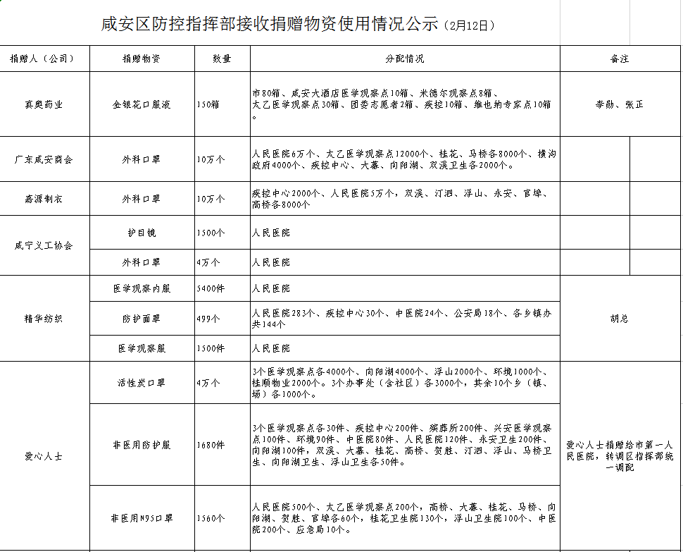 现将咸安区疫情防控指挥部接受社会各界捐赠的物资、资金使用情况公示如下,后续捐赠将持续公布,敬请关注: