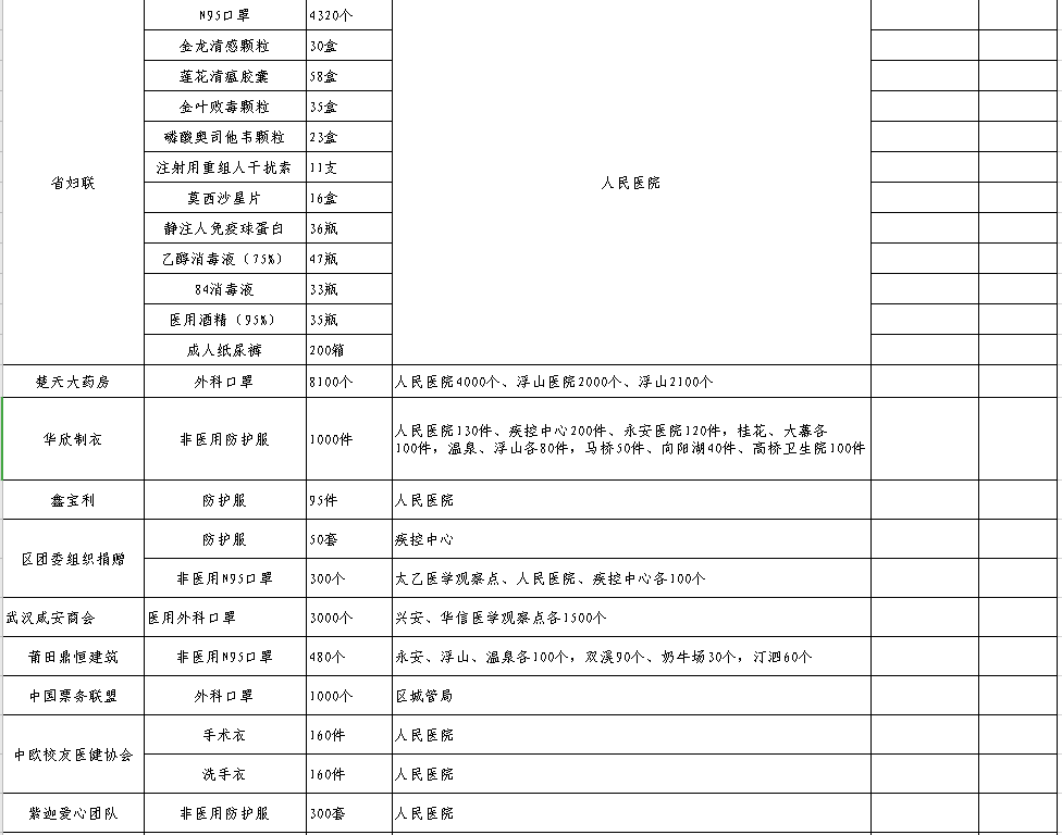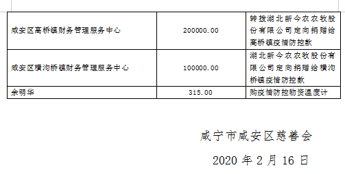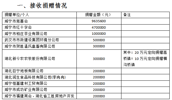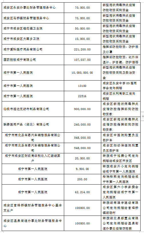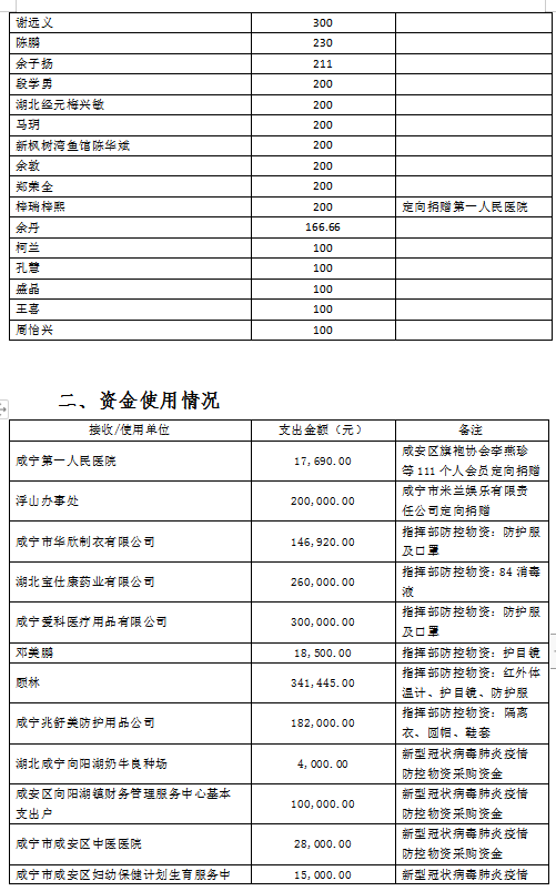 截止2020年2月15日24时,咸宁市咸安区慈善会收到“咸安疫情防控”捐赠款人民币共计20519668.96元,支出16121637元,结余4398031.96元(详见明细表)。