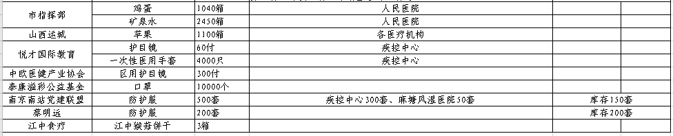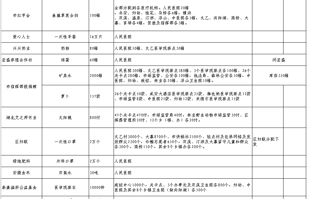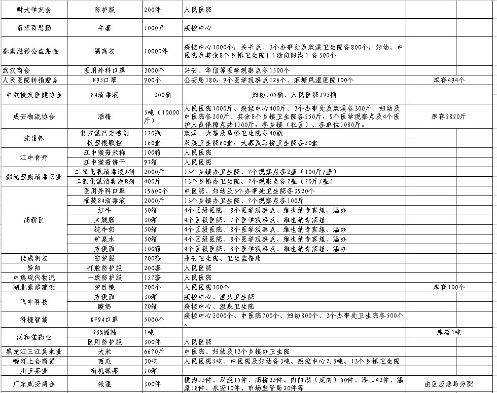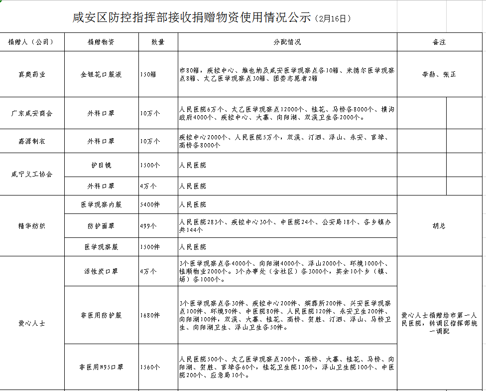 现将咸安区疫情防控指挥部接受社会各界捐赠的物资、资金使用情况公示如下,后续捐赠将持续公布,敬请关注: