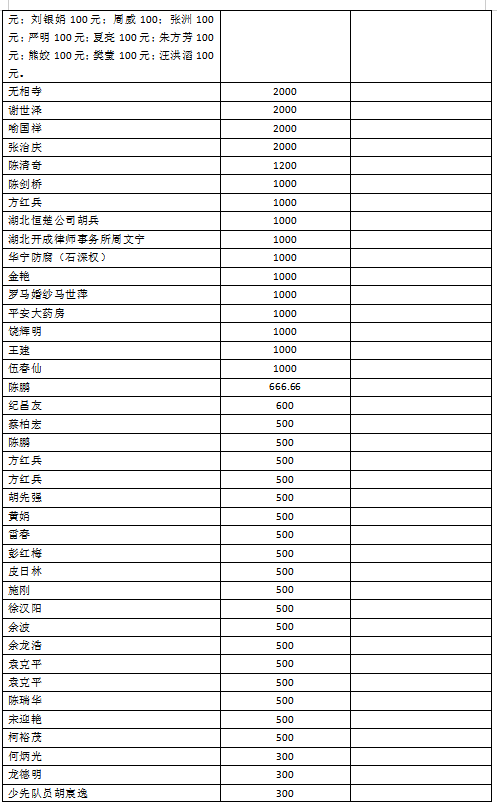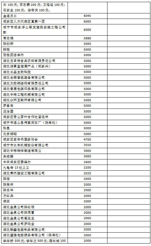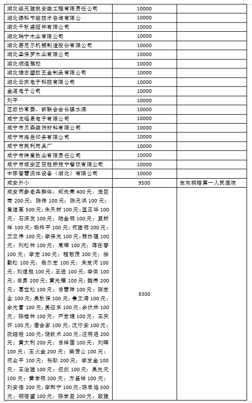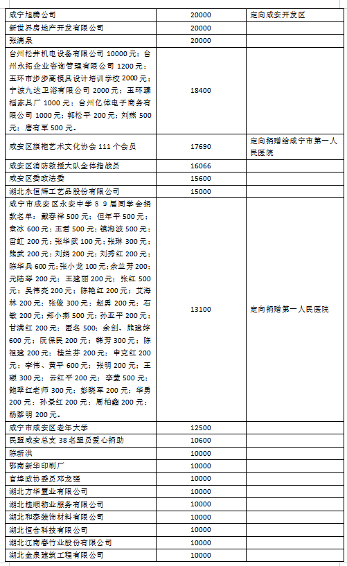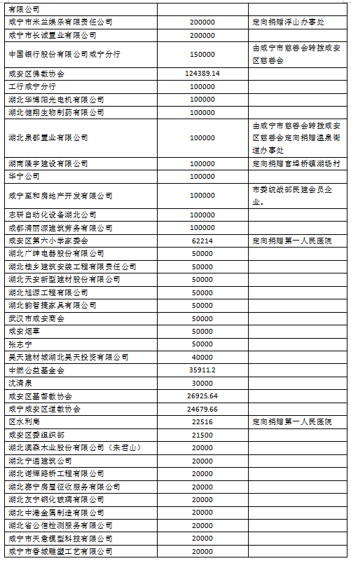 国家危难,匹夫有责;面对疫情,同舟共济;涓涓细流,汇成大爱!疫情发生以来,社会各界爱心如潮,关注、关心、支持咸安抗击疫情,慷慨解囊,无私奉献!