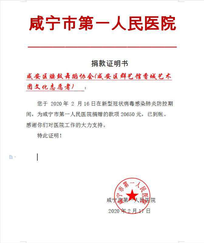 据悉,咸安区群艺馆香城艺术团志愿者暨区腰鼓舞蹈协会和广场舞队、腰鼓队的队员们积极响应,纷纷贡献自己的一份爱心,也为社会尽一份责任。在短短的一天多时间里,190名志愿者募集爱心捐款20650元;咸安区象棋协会36名志愿者募集爱心捐款16567.66元;咸安区桂香艺术团124名志愿者募集爱心捐款15400元,共计52617.66元,所有捐款全部捐给湖北省咸宁市第一人民医院。