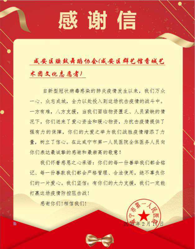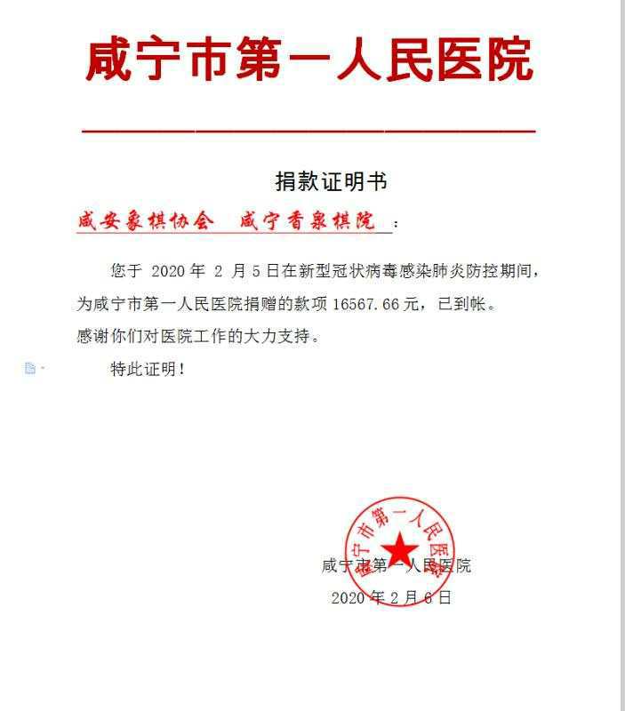 目前,这笔爱心款已转给市第一人民医院。对此,该院及时给咸安区腰鼓舞蹈协会、咸安区象棋协会寄来了《捐款证明书》,并附上了语言真挚、情真意切的《感谢信》,以表达感激之情。