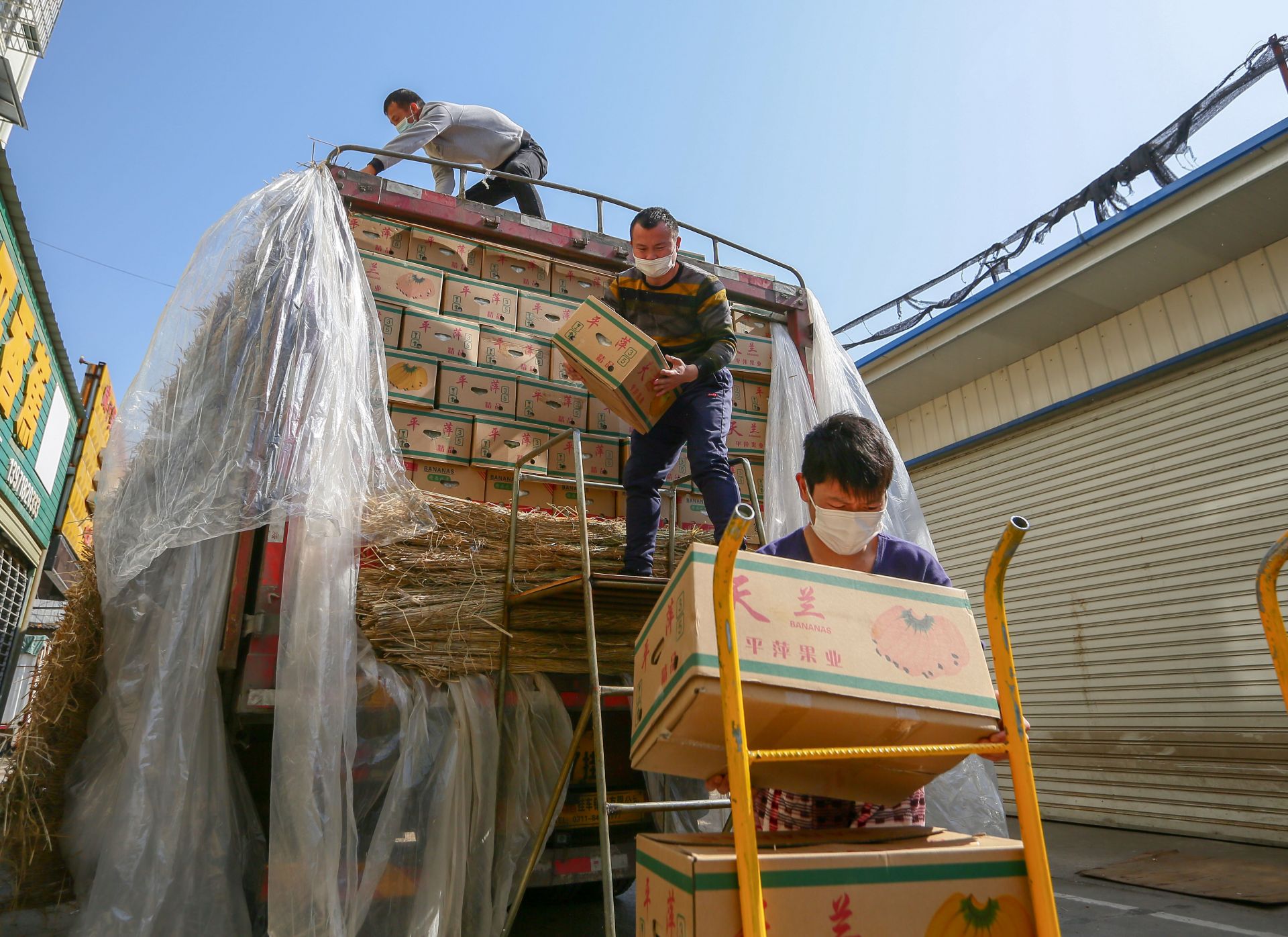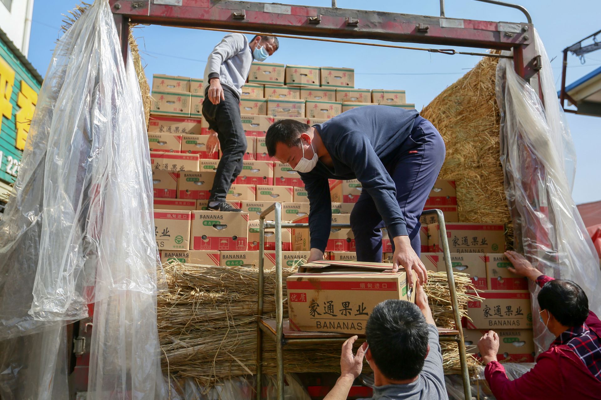 记者在现场看到,几名工作人员正有序地将一箱箱香蕉从车上卸运下来,搬入冷冻库。