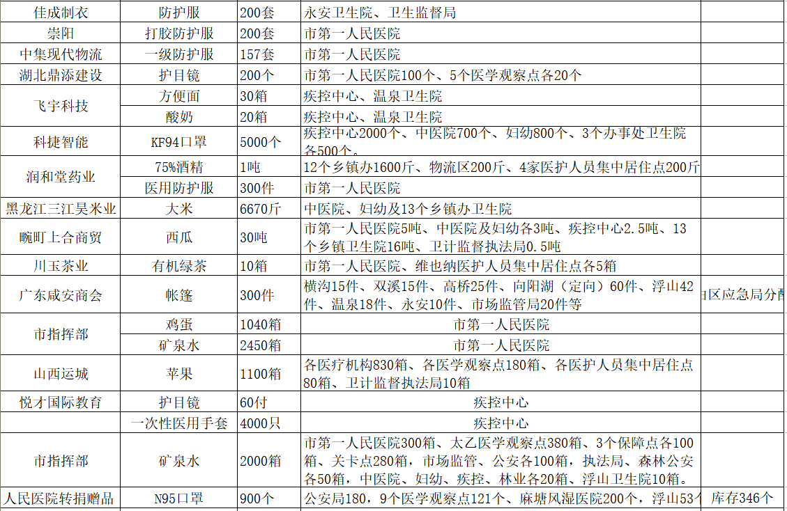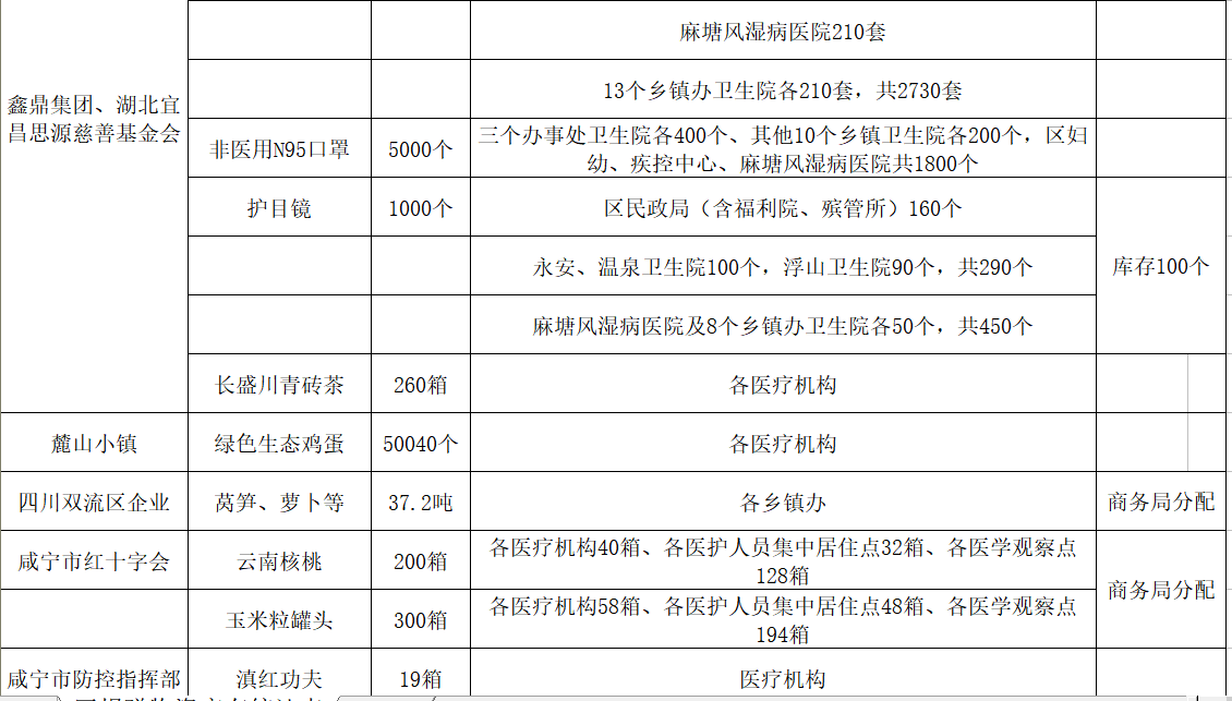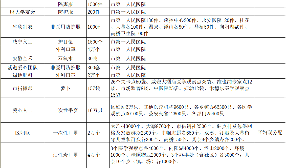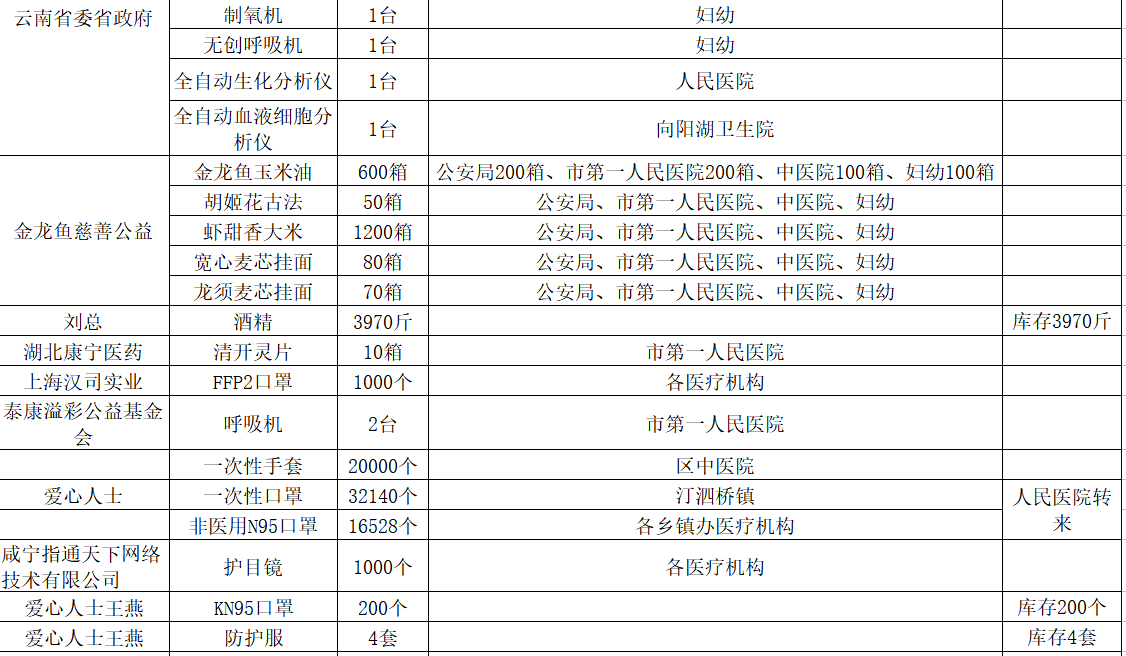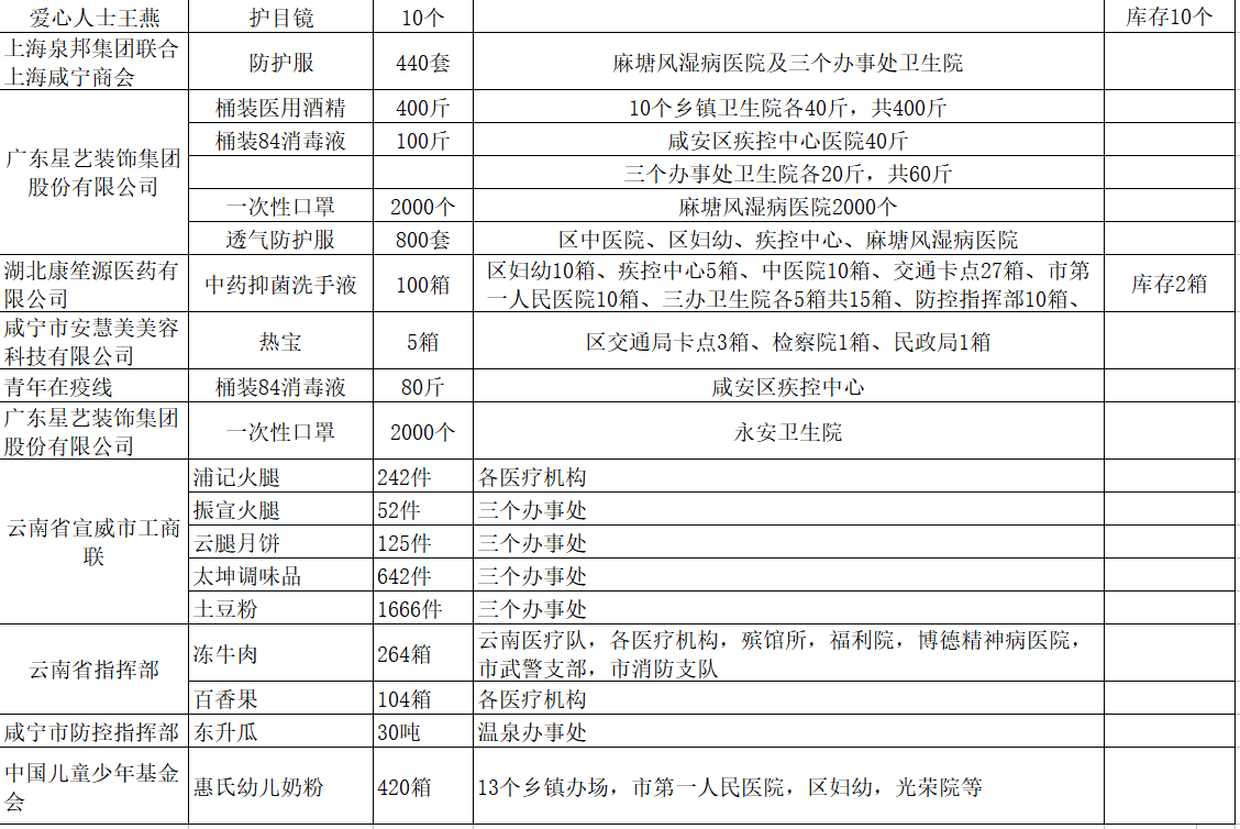 现将咸安区疫情防控指挥部接受社会各界捐赠的物资、资金使用情况公示如下,后续捐赠将持续公布,敬请关注!
